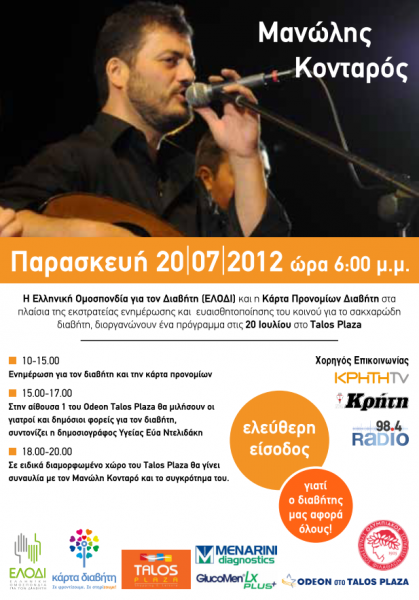 Συγκεκριμένα, στο πλαίσιο της εκστρατείας αυτής, θα πραγματοποιηθεί την Παρασκευή 20 Ιουλίου στο Talos Plaza (Σοφοκλή Βενιζέλου Μίνωος & Πελασγών) στο Ηράκλειο Κρήτης, εκδήλωση την οποία διοργανώνουν η ΕΛΟΔΙ και η Κάρτα Διαβήτη, με την υποστήριξη της Π.Α.Ε. Ολυμπιακός και κατά την οποία θα ενημερωθεί το κοινό από τους κ.κ. Ν. Κεφαλογιάννη (Διευθυντή Διαβητολογικού κέντρου Γ. Ν. Ηρακλείου Κρήτης), Δ. Μαμουλάκη (Διευθυντή Παιδοδιαβητολογικού Ιατρείου ΠΑΓΝΗ), Στ. Λιναρδάκη (Διαιτολόγο – Διατροφολόγο, Προϊστάμενο τμήματος Διατροφής Βενιζέλειου Νοσοκομείου) καθώς και την κυρία Μ. Βλατά (ειδική παθολόγο στο Ιατρικό Ηρακλείου Κρήτης), για το σημαίνει να έχει κανείς διαβήτη αλλά και για το πώς μπορούμε να βοηθήσουμε.