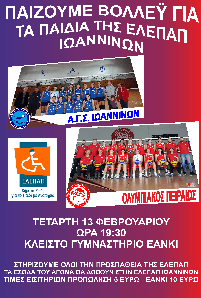 Ο Ολυμπιακός Σ.Φ.Π. δείχνοντας για ακόμη μία φορά το κοινωνικό του πρόσωπο θα συμμετάσχει, με την ομάδα βόλεϊ γυναικών, σε φιλικό παιχνίδι φιλανθρωπικού χαρακτήρα στα Ιωάννινα, για να στηρίξει την προσπάθεια της Ελληνικής Εταιρείας Προστασίας και Αποκαταστάσεως Αναπήρων Παίδων.