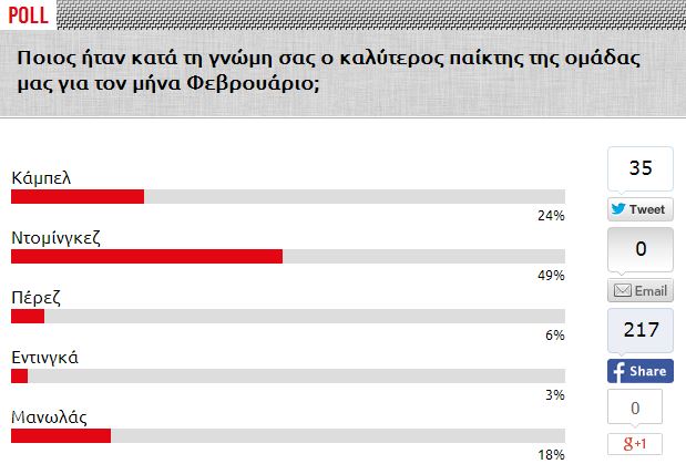 Τα σημαντικά γκολ του Ντομίνγκεζ τον μήνα που μας πέρασε, αλλά και η συνολική του παρουσία στα παιχνίδια της ομάδας μας του έδωσαν την πρωτιά με το 49% των φιλάθλων να τον ψηφίζουν.