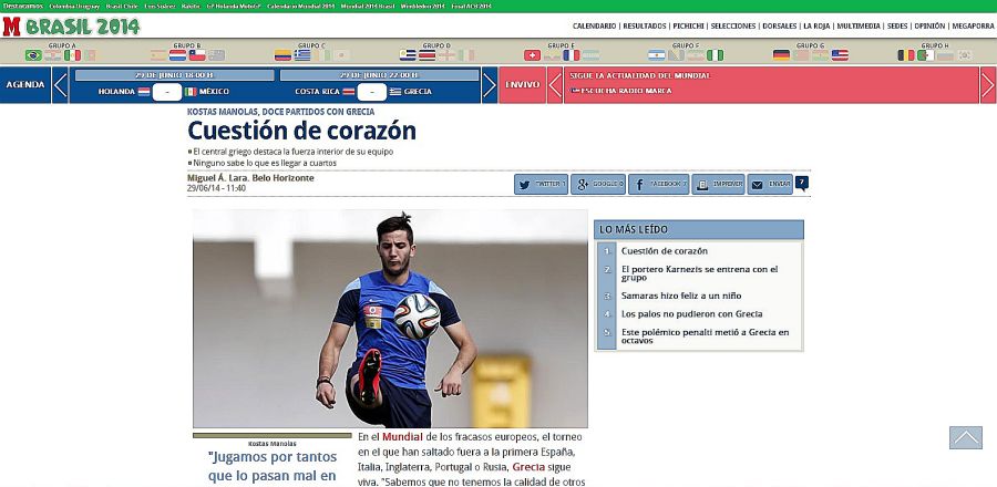 Ο Κώστας Μανωλάς έχει τραβήξει και συνεχίζει να τραβάει το ενδιαφέρον με τις εξαιρετικές εμφανίσεις που πραγματοποιεί στο Μουντιάλ της Βραζιλίας, φορώντας το εθνόσημο! Ο Έλληνας κεντρικός αμυντικός του Θρύλου παραχώρησε συνέντευξη στο παγκοσμίου φήμης ισπανικό Μέσο, τη Marca. Η συνέντευξη έκανε τον γύρο του κόσμου, ενώ μεταξύ άλλων ο Κώστας Μανωλάς τονίζει ότι κάθε παιχνίδι της Ελλάδας είναι «ζήτημα καρδιάς».