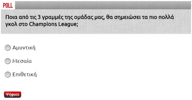 Την φετινή περίοδο ποια από τις τρεις γραμμές της ομάδας μας, πιστεύετε πως θα σημειώσει τα περισσότερα γκολ στο UEFA Champions League; Για να απαντήσετε σε αυτό το ερώτημα, πατήστε ΕΔΩ.