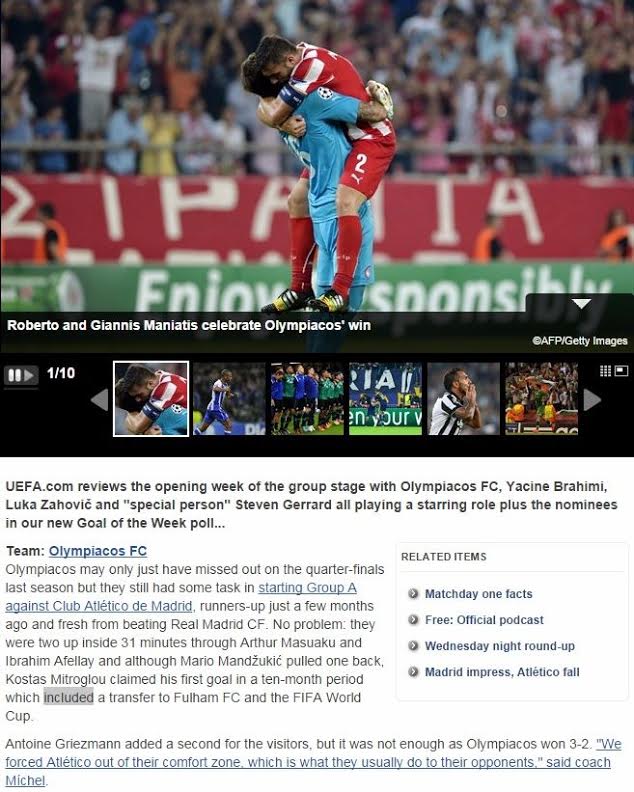«Ο Ολυμπιακός μπορεί να έφτασε μία ανάσα από τα προημιτελικά του Champions League την περσινή σεζόν, αλλά είχε ακόμη δουλειά στην πρεμιέρα του ομίλου του Champions League κόντρα στη φιναλίστ του θεσμού πριν από λίγους μήνες, Ατλέτικο Μαδρίτης, και η οποία μόλις κέρδισε τη Ρεάλ.