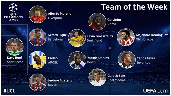 Αναλυτικά, κάτω από την εστία επέλεξε τον Ρόεφ της Άντερλεχτ, ενώ στην άμυνα τους Μορένο (Λίβερπουλ), Πικέ (Μπαρτσελόνα), Μπόατενγκ (Μπάγερν) και Καρλάο (ΑΠΟΕΛ).