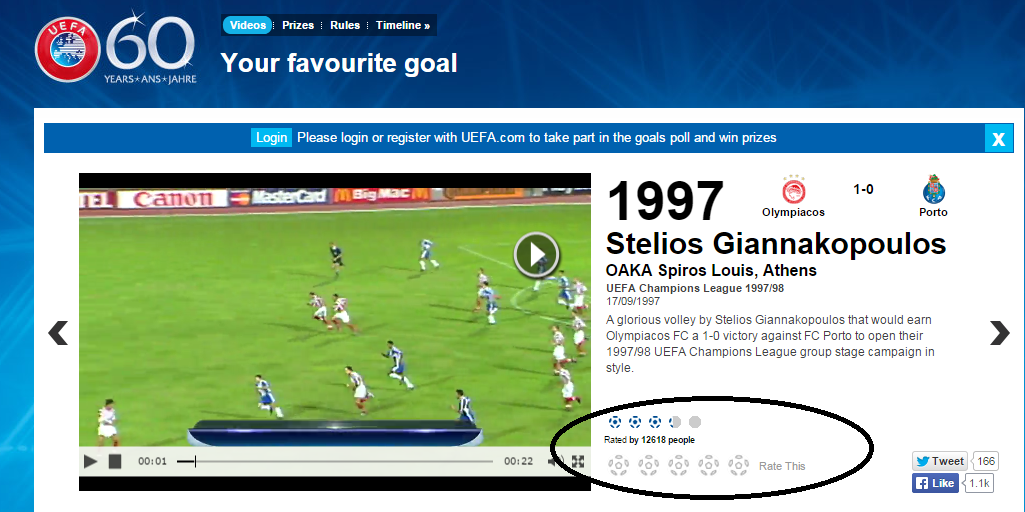 Η UEFA γιορτάζει τα 60 χρόνια από την ίδρυσή της και μέσα στις ενέργειες που κάνει για τον εορτασμό των γενεθλίων της, είναι και η ψηφοφορία του κοινού για την ανάδειξη του καλύτερου γκολ στην ιστορία των διοργανώσεων της ευρωπαϊκής ομοσπονδίας ποδοσφαίρου.