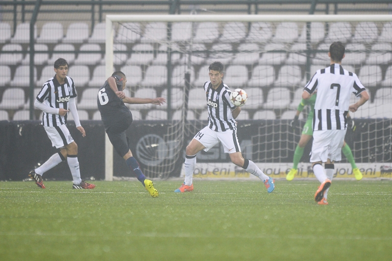 Δυνατό ματς στα πρώτα 45 λεπτά του αγώνα με αρκετάεπικίνδυναμαρκαρίσματα, πολλές κίτρινες κάρτες όπως επίσης και μία κόκκινη για την ομάδα της Γιουβέντους. Οι Νέοι του Ολυμπιακού μπήκαν με όρεξη στην αναμέτρηση και είχαν καλές ευκαιρίες μπροστά από την εστία του Οντέρο για να πάρουν το προβάδισμα. Κύριοι εκφραστές των επιθέσεων των «ερυθρόλευκων» ο Γαρεφαλάκης με τον Ιγνατίδη. Οι «μικροί» του Ολυμπιακού ήταν κινητικοί, είχαν τον έλεγχο των κινήσεων και κατάφεραν να μην απειληθούν ιδιαίτερα. Οι Ιταλοί έμειναν με 10 ποδοσφαιριστές στο 38ο λεπτό μετά από σκληρό μαρκάρισμα πάνω στον Τσιμήκα. Συνολικά στο πρώτο μέρος ο διαιτητής έδειξε από δύο κίτρινες κάρτες στις ομάδες, όπως και την κόκκινη στους γηπεδούχους. Στα αξιοσημείωτα του πρώτου μέρους είναι πως η Γιουβέντους έκανε και τις τρεις αλλαγές της.
