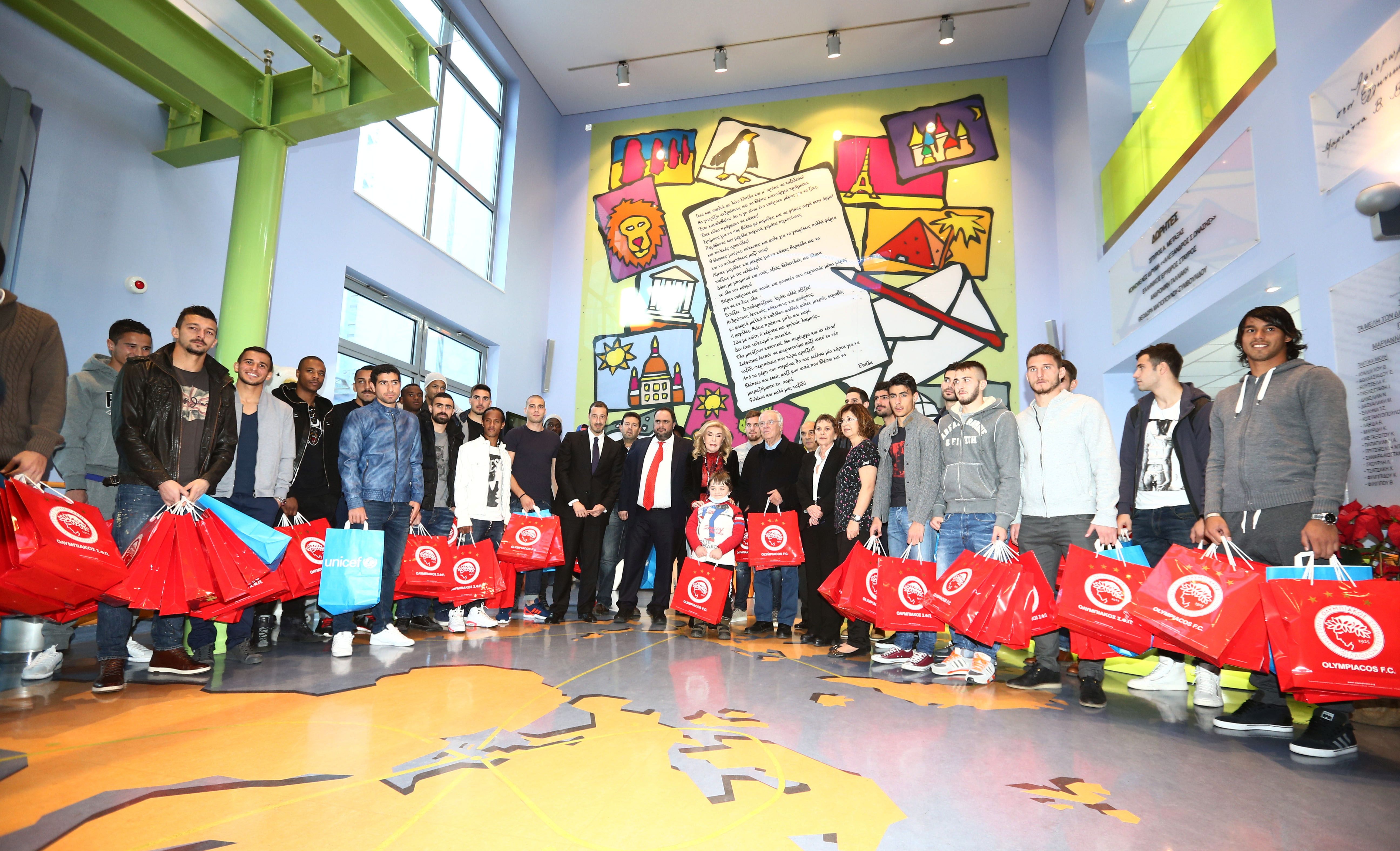 Η κα. Μαριάννα Βαρδινογιάννη τίμησε τον κ. Μαρινάκη με την πλακέτα του Ιδρύματος Ελπίδα, για την τεράστια προσφορά του προς το Ίδρυμα και -προπάντων- τη βοήθεια προς τα ίδια τα παιδιά, στη μάχη που δίνουν με τον καρκίνο. Η κα. Βαρδινογιάννη τίμησε και τον προπονητή του Ολυμπιακού, κ. Βίτορ Περέιρα, όπως και όλη την ομάδα του Ολυμπιακού, η οποία έδωσε το παρών. Ο αντιπρόεδρος κ. Σάββας Θεοδωρίδης, ο Αθλητικός Διευθυντής κ. Ισά, ο Αντώνης Νικοπολίδης, όλοι οι ποδοσφαιριστές (πλην του Αλεχάντρο Ντομίνγκεζ, ο οποίος ταλαιπωρείται από ίωση) βρέθηκαν εκεί, κοντά στα παιδιά και τους έδωσαν χαμόγελα και… ΕΛΠΙΔΑ! Τους μοίρασαν δώρα, έπαιξαν μαζί τους ακόμη και… ποδοσφαιράκι και έβγαλαν πολλές φωτογραφίες.