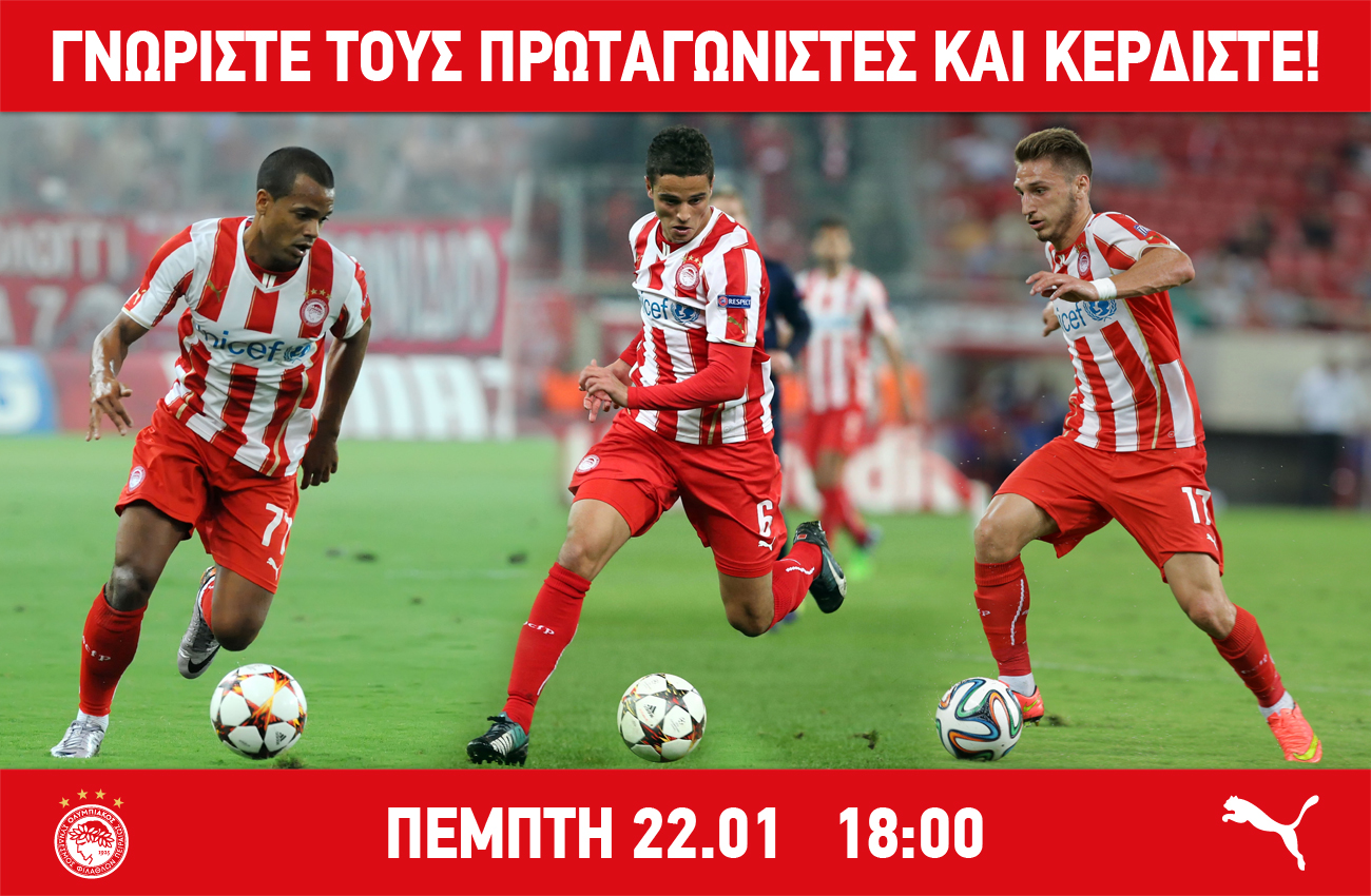 Την Πέμπτη 22.01 στις 18:00 οι ποδοσφαιριστές του Ολυμπιακού Ibrahim Afellay, Δημήτρης Διαμαντάκος & Mathieu Dossevi θα βρίσκονται στο κατάστημα PUMA Πειραιά, Γρ. Λαμπράκη 138.