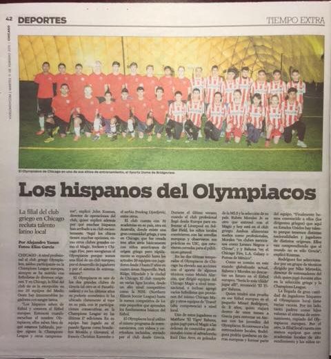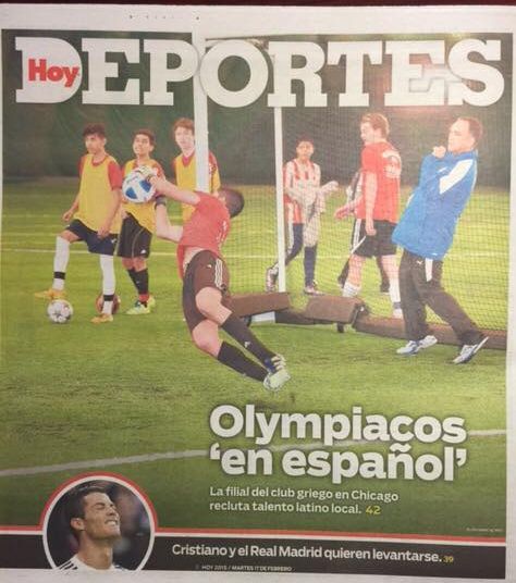 Ένα εξαιρετικό αφιέρωμα στη Σχολή του Ολυμπιακού στο Σικάγο “φιλοξένησε” στις σελίδες της η ισπανόφωνη εφημερίδα της πόλης του Ιλινόις “Hoy Deportes”. Η Σχολή μας στο Σικάγο, η οποία μετράει τρία χρόνια λειτουργίας, έχει στο δυναμικό της πάνω από 250 παιδιά και τα 145 κατάγονται από την Λατινική Αμερική και συγκεκριμένα από το Μεξικό και την Αργεντινή. Στο πολυσέλιδο αφιέρωμα που έφτιαξε η εφημερίδα “φιλοξενούνται” δηλώσεις του Επικεφαλή της Σχολής κ. Γιάννη Κοσμά ο οποίος μεταφέρει με επιτυχία την ιδέα του Ολυμπιακού στο Σικάγο.