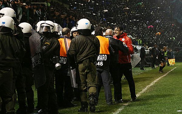 Ένας κουκουλοφόρος, ο οποίος ήταν εντός αγωνιστικού χώρου και πίσω από το τέρμα, τον προκάλεσε, βρίζοντάς τον χυδαία! Ο Πορτογάλος τεχνικός δεν έδειξε σημάδια φόβου (κάτι που ο κουκουλοφόρους οπαδός του Παναθηναϊκού ήθελε να πετύχει) και τότε ανέλαβαν δράση και οι υπόλοιποι «πράσινοι» οπαδοί, που ήταν πίσω από το τέρμα, στην εξέδρα.