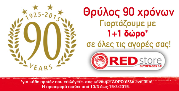 Με αφορμή την συμπλήρωση 90 χρόνων της ομάδας μας το κατάστημα RED Store γιορτάζει και προσφέρει με την αγορά κάθε προϊόντος άλλο ένα ίδιο δώρο. Η προσφορά ισχύει από 10/03/2015 – 15/03/2015 για το κατάστημα στο Στάδιο «Γ. Καραϊσκάκης» και για αγορές μόνο από το κατάστημα.