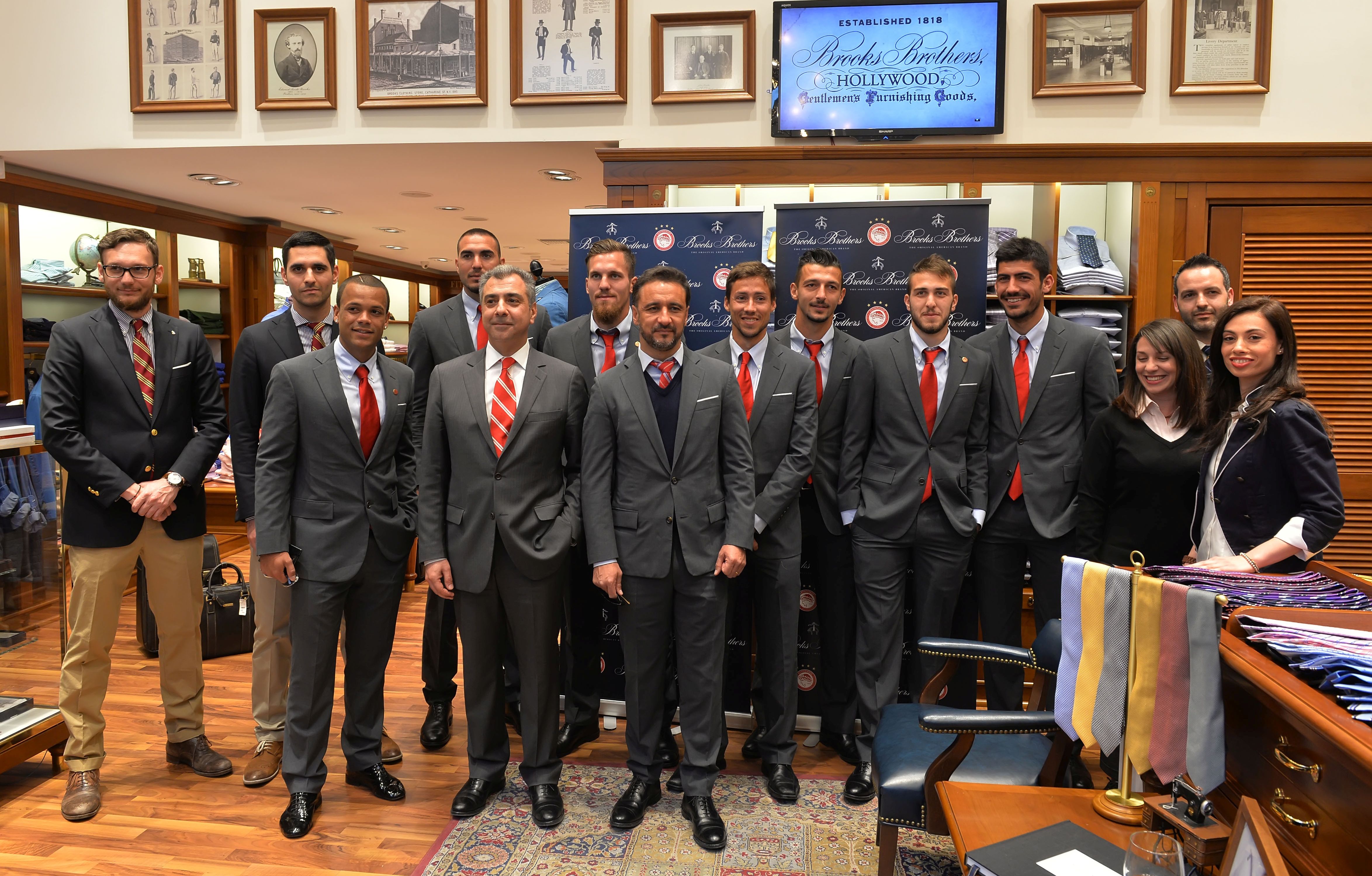 Οι ποδοσφαιριστές του Ολυμπιακού, Ανδρέας Μπουχαλάκης, Κώστας Φορτούνης, Κώστας Γιαννούλης, Ρομπέρτο, Μπάλαζ Μέγιερι, Νταβίντ Φουστέρ, Ματιέ Ντοσεβί, όπως και ο προπονητής κ. Περέιρα, ο Αντιπρόεδρος της ΠΑΕ κ. Σάββας Θεοδωρίδης και ο Διευθυντής Επικοινωνίας της ΠΑΕ Ολυμπιακός, κ. Κώστας Καραπαπάς βρέθηκαν στο κατάστημα της Brooks Brothers στον Πειραιά, σε μια εκδήλωση ειδικά αφιερωμένη στη συμπλήρωση 90 χρόνων από την ίδρυση του Θρύλου. Κατά τη διάρκεια της εκδήλωσης οι ποδοσφαιριστές και τα στελέχη της ομάδας είχαν την ευκαιρία να δουν από κοντά τη νέα συλλογή Άνοιξη – Καλοκαίρι 2015 της Brooks Brothers και να κάνουν τις αγορές τους.
