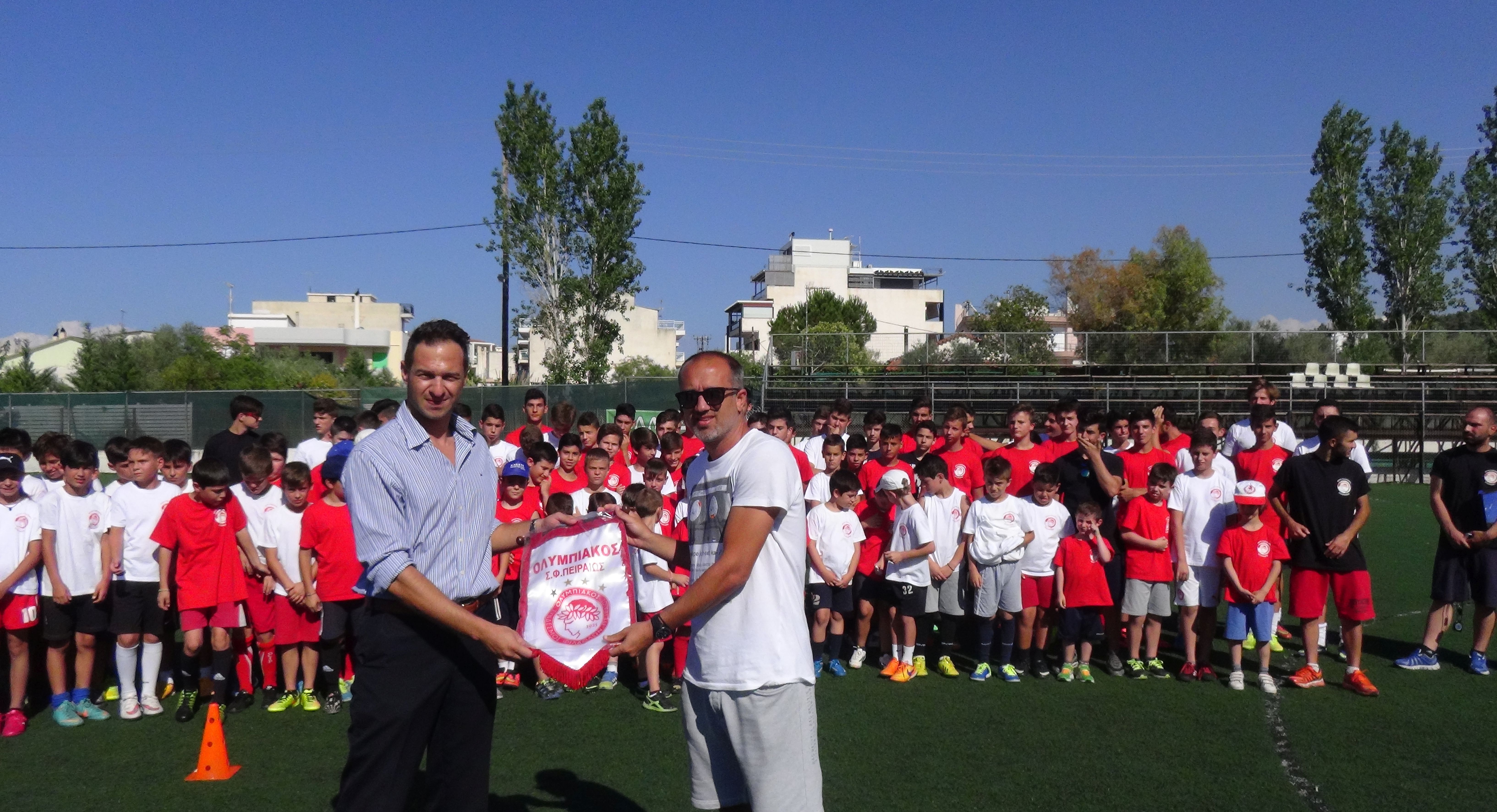 Ο κ. Μαυρογενίδης έδωσε στον κ. Δημητρόπουλο λάβαρο της ΠΑΕ Ολυμπιακός και καταχειροκροτήθηκε από τα 150 παιδιά που συμμετέχουν στο Camp το οποίοι οι υπεύθυνοι της Σχολής φιλοδοξούν να γίνει θεσμός για την περιοχή. Ο προπονητής της Κ-17 μιλώντας στα παιδιά τους τόνισε: “Πρέπει πάνω απ΄ όλα το ποδόσφαιρο να είναι παιχνίδι για εσάς. Είναι ένα συναρπαστικό άθλημα και είστε τυχερά που υπάρχει μια Σχολή του Ολυμπιακού στην περιοχή σας. Με δουλειά και μεράκι έρχονται οι επιτυχίες”.