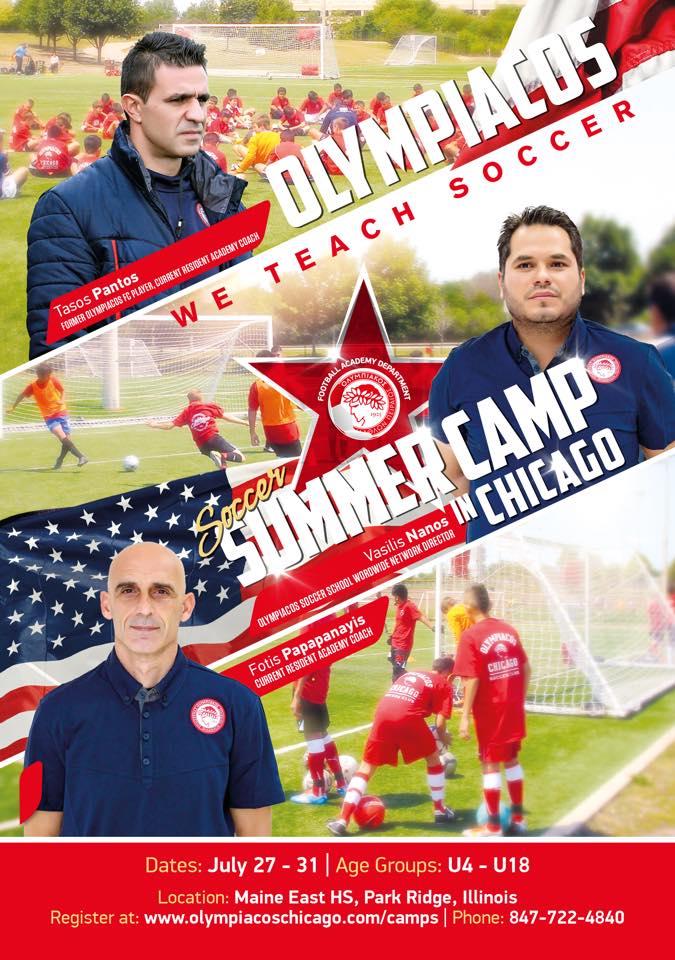 Η Σχολή Ποδοσφαίρου του Ολυμπιακού στο Σικάγο διοργανώνει στο διάστημα 27-31 Ιουλίου στις εγκαταστάσεις της Summer Camp για αγόρια και κορίτσια από 4 έως 18 ετών! Στην προσπάθεια της αυτή θα έχει την αμέριστη υποστήριξη της Ακαδημίας του Ολυμπιακού η οποία θα έχει και εκπροσώπους στην πόλη του Ιλινόις.