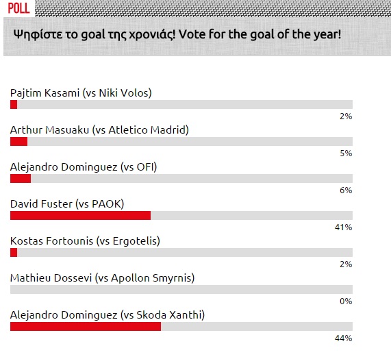 Από την αρχή φάνηκαν 2 goals να ξεχωρίζουν… Αυτό του Νταβίντ Φουστέρ, στην εντός έδρας αναμέτρηση με τον ΠΑΟΚ και του Αλεχάντρο Ντομίνγκεζ με την Ξάνθη, στον τελικό του Κυπέλλου, εκεί όπου η ομάδα μας κατέκτησε το τρόπαιο και έκλεισε την χρονιά με το νταμπλ. Δύο σπάνιας ομορφιάς γκολ, που από την αρχή της ψηφοφορίας είχαν πάρει μεγάλη διαφορά από τα υπόλοιπα! Ήταν πολύ κοντά σε ψήφους και μέχρι την τελευταία στιγμή είχαμε… ντέρμπι!