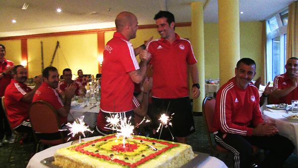 Λίγη ώρα πριν το δείπνο ολοκληρωθεί, στον χώρο όπου έτρωγε η ομάδα «εισέβαλε» μια τούρτα γενεθλίων και όλη η αποστολή άρχισε να τραγουδάει το «happy birthday»! Πολλά χαμόγελα, τόσο από τον ίδιο τον κ. Σίλβα, όσο και από τους ποδοσφαιριστές, αλλά και όλα τα μέλη του staff. Ο Πορτογάλος τεχνικός έσβησε το κεράκι του και είχε θερμότατες χειραψίες με τον Αντιπρόεδρο, κ. Κουντούρη, τον Αθλητικό Διευθυντή κ. Γεωργάτο, τον Διευθυντή Επικοινωνίας κ. Καραπαπά, τον team manager Κούλη Δουρέκα, φυσικά τους συνεργάτες του, καθώς και με τα μέλη του τεχνικού επιτελείου.