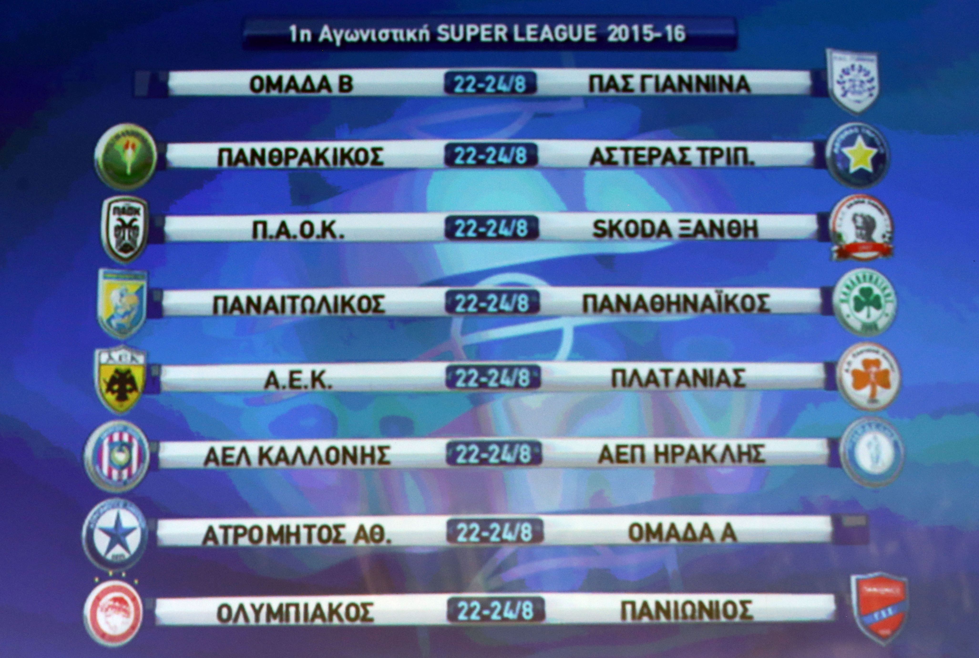 Πραγματοποιήθηκε η κλήρωση του πρωταθλήματος Super League για τη σεζόν 2015-16, με τον Ολυμπιακό να ξεκινά απέναντι στον Πανιώνιο στο Καραϊσκάκη.