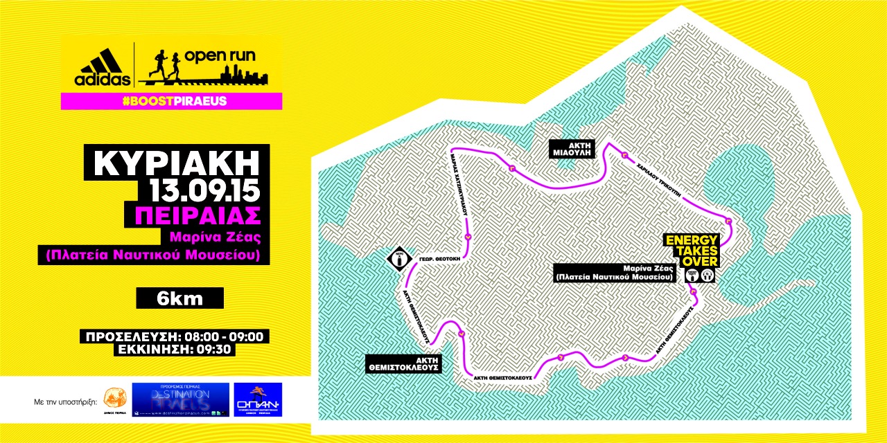 Το3οadidas Open Run είναι επιτέλους εδώ! Για πρώτη φορά, το πιο energy running event της πόλης κατηφορίζει νότια και σε περιμένει στην πλατεία Ναυτικού Μουσείου στη Μαρίνα Ζέας για να τρέξουμε παρέα στην πιο όμορφη διαδρομή του Πειραιά. Και επειδή η καλύτερη ώρα για τρέξιμο είναι το πρωί, την Κυριακή 13 Σεπτεμβρίουξυπνάμε νωρίς, φοράμε τα αθλητικά μας και γεμίζουμε ενέργεια όλο τονΠειραιά στις 9.30 πμ. Μαζί θα τρέξουμε στην πιο απολαυστική διαδρομή των6χλμ, η οποία ξεκινάει από τη Μαρίνα Ζέας, περνάει από το κέντρο του Πειραιά και διασχίζει την ακτή Μιαούλη και την ακτή Θεμιστοκλέους.