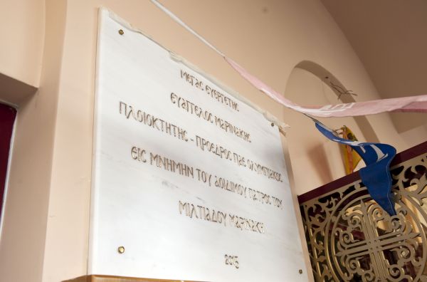 Ο Πρόεδρος κ. Μαρινάκης ενίσχυσε οικονομικά, με ένα μεγάλο ποσό, την αποπεράτωση του Ιερού Ναού και ανήμερα της εορτής του Αγίου Ελευθερίου έγιναν τα εγκαίνια. Ο κ. Βαγγέλης Μαρινάκης παρακολούθησε όλη τη λειτουργία, ενώ στο τέλος αυτής έλαβαν χώρα και τα αποκαλυπτήρια μιας τιμητικής πλακέτας, στο όνομα του Προέδρου. Ο ηγέτης του Ολυμπιακού ανακηρύχθηκε Μέγας Ευεργέτης του Ιερού Ναού, για τη σημαντική προσφορά του συνολικά, ενώ η πλακέτα η οποία αποκαλύφθηκε, ήταν για να τιμηθεί η μνήμη του πατέρα του, Μιλτιάδη Μαρινάκη.