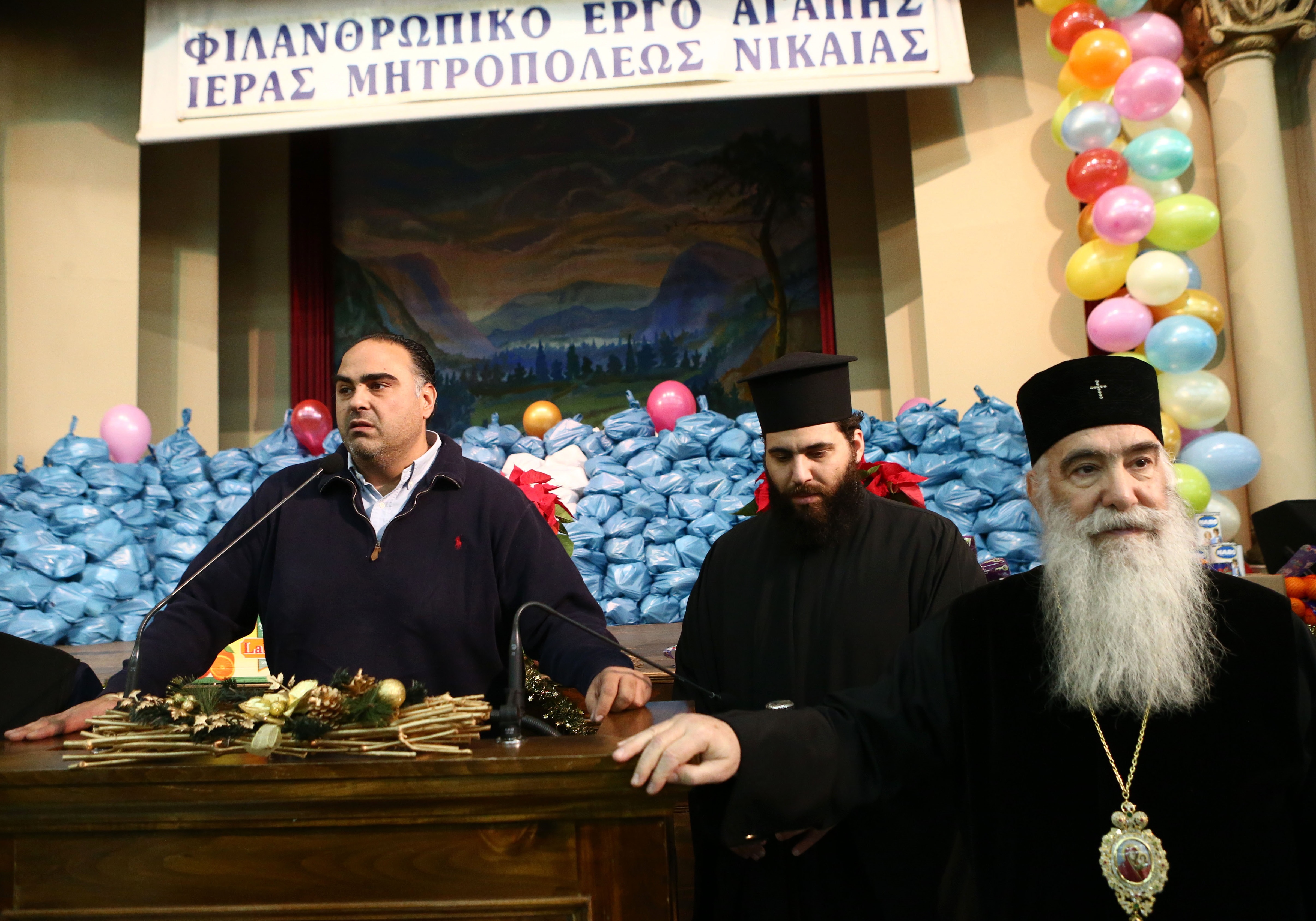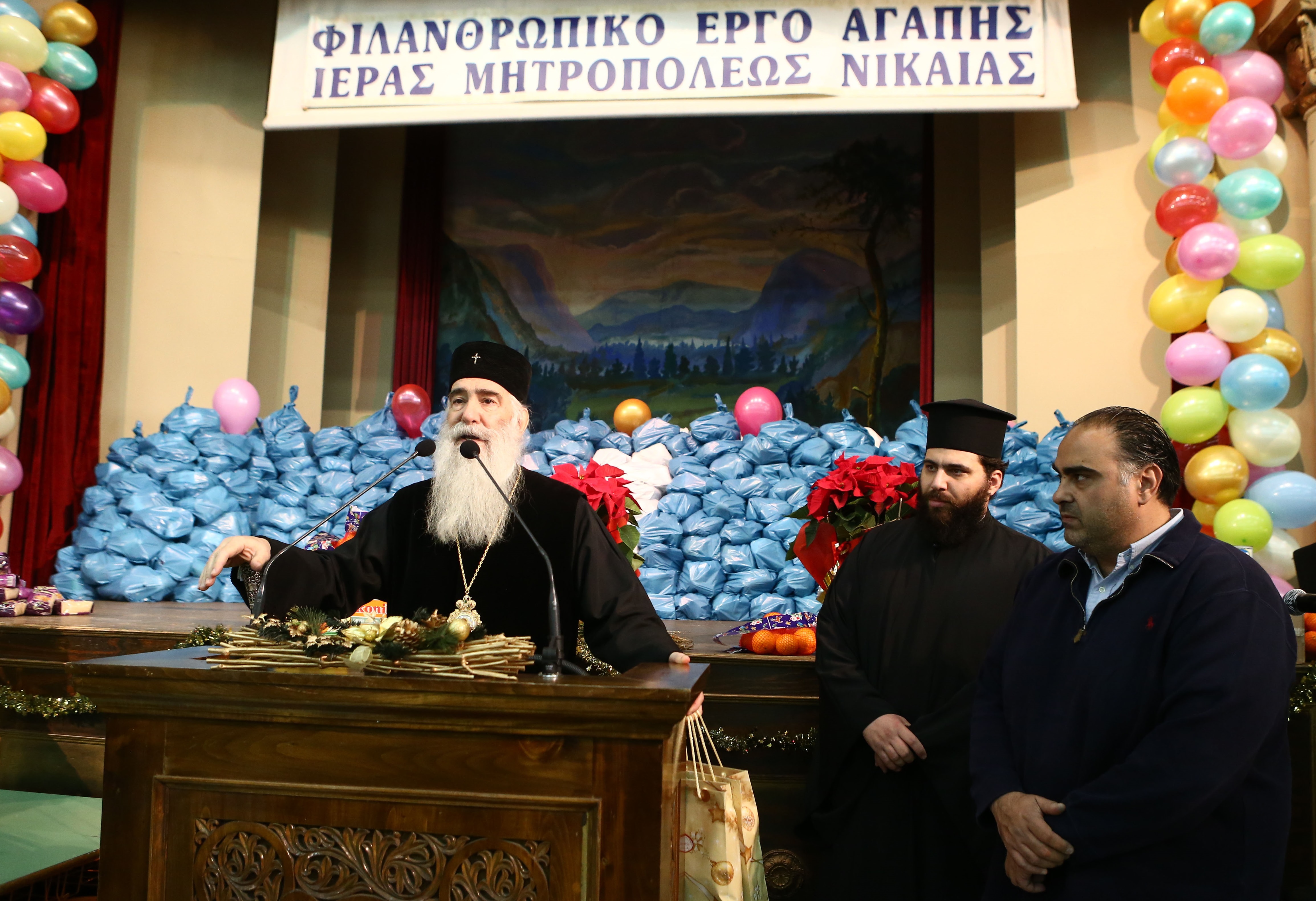 Μιλώντας από το βήμα και προς τον κόσμο που ήταν εκεί, ο Σεβασμιώτατος Μητροπολίτης Νικαίας κ.κ. Αλέξιος είπε: «Φτάσαμε στις μέρες των Χριστουγέννων. Μας αξίωσε ο Θεός. Είμαστε εδώ στο Πνευματικό Κέντρο και θέλω να σας πω ότι σας αγαπάει η Εκκλησία κι εγώ προσωπικά σας έχω στην καρδιά μου. Θέλω να είστε ευτυχισμένοι και να ξεπερνάτε τις όποιες δυσκολίες της ζωής. Το μεγαλύτερο εφόδιο που θα δώσετε στα παιδιά και τα εγγόνια σας είναι ο δρόμος του Χριστού. Ο Χριστός είναι η ζωή. Όποιος είναι ενωμένος με τον Χριστό έχει δύναμη να ξεπεράσει τις δυσκολίες της ζωής. Υπάρχουν είδη διατροφής για όλους.