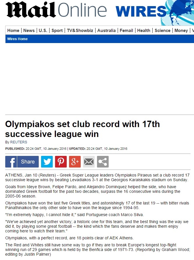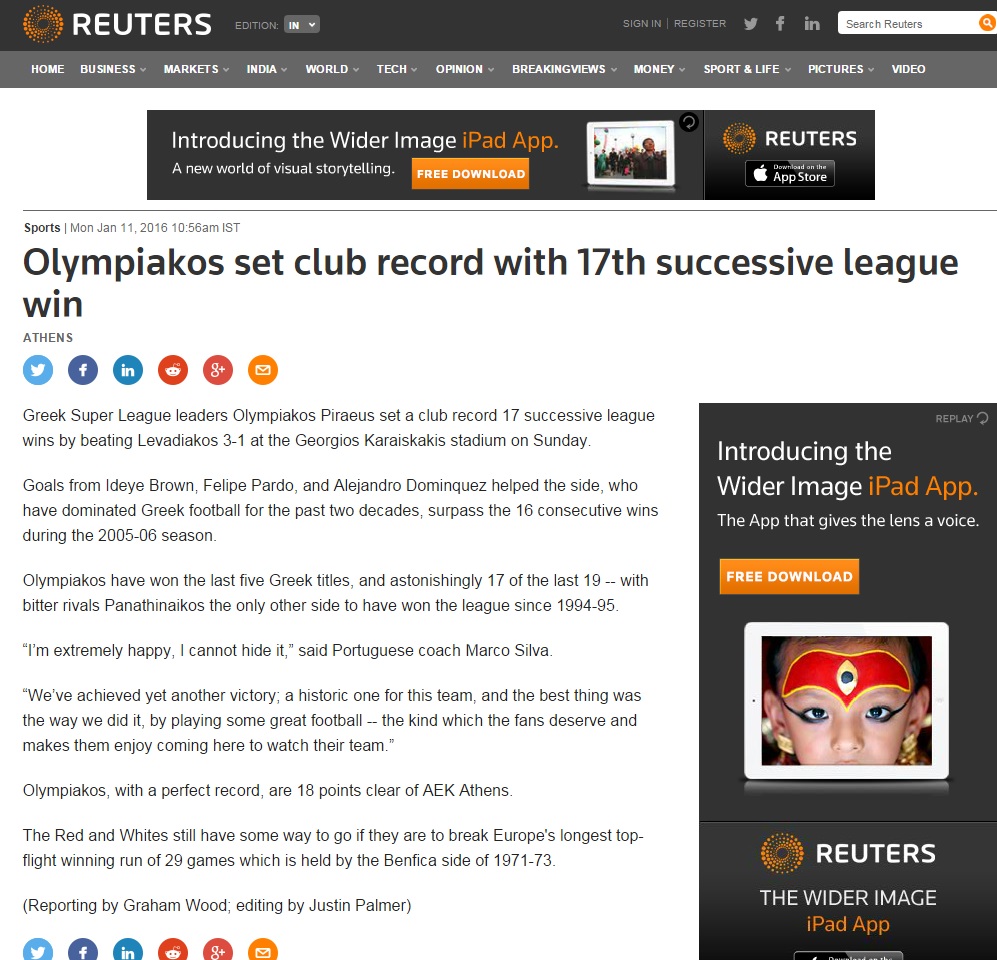 BBC, Mirror, Dailymail, Reuters, Yahoo, Eurosport, Washingtontimes, L’ Equipe, Prosport, Sport SME, HLN.beκαι πολλά ακόμα μεγάλα διεθνή sites αναφέρονται στο «17 στα 17» του Θρύλου, το οποίο είναι τεράστιο επίτευγμα, όχι μόνο εντός Ελλάδος, αλλά και σε όλη την Ευρώπη!