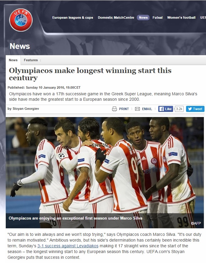 Αυτό το επίτευγμα της ομάδας του Σίλβα είναι τεράστιο και αποδεικνύεται και από τις πολλές αναφορές διεθνών μέσων, με διθυραμβικά σχόλια. Το επίσημο site της UEFA κάνει ειδική μνεία στους νταμπλούχους Ελλάδος αναφέροντας ότι κατέχουν πλέον ένα ακόμα ρεκόρ! Τις περισσότερες συνεχόμενες νίκες σε οποιοδήποτε ευρωπαϊκό πρωτάθλημα, από το 2000 και μετά.