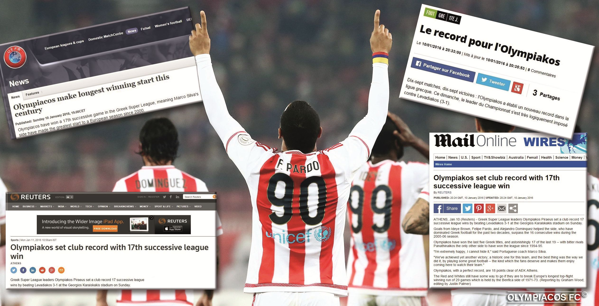 Ο Ολυμπιακός μετά τη νίκη του την Κυριακή το βράδυ επί του Λεβαδειακού με 3-1 στο «Γεώργιος Καραϊσκάκης», πέτυχε την 17η νίκη σε ισάριθμα ματς στην Super League και κατέρριψε ένα ακόμα ρεκόρ, αυτό της ομάδας του Σόλιντ (16 συνεχόμενες νίκες).