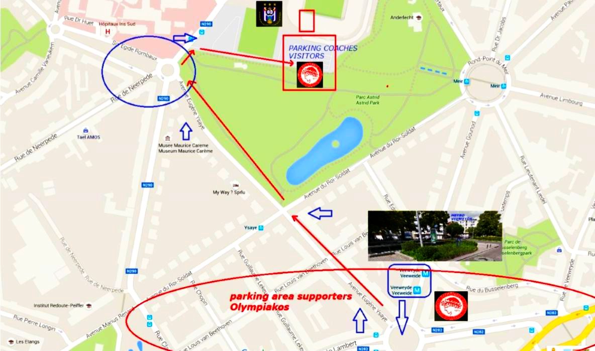 Παρακαλούμε τους φιλάθλους του Ολυμπιακού, οι οποίοι θα ταξιδέψουν με δικά τους, ιδιωτικά οχήματα, να τα παρκάρουν στην περιοχή γύρω από τον σταθμό του Μετρό (Tube) Veeweyde (στην πλατεία Verdi, Anderlecht).