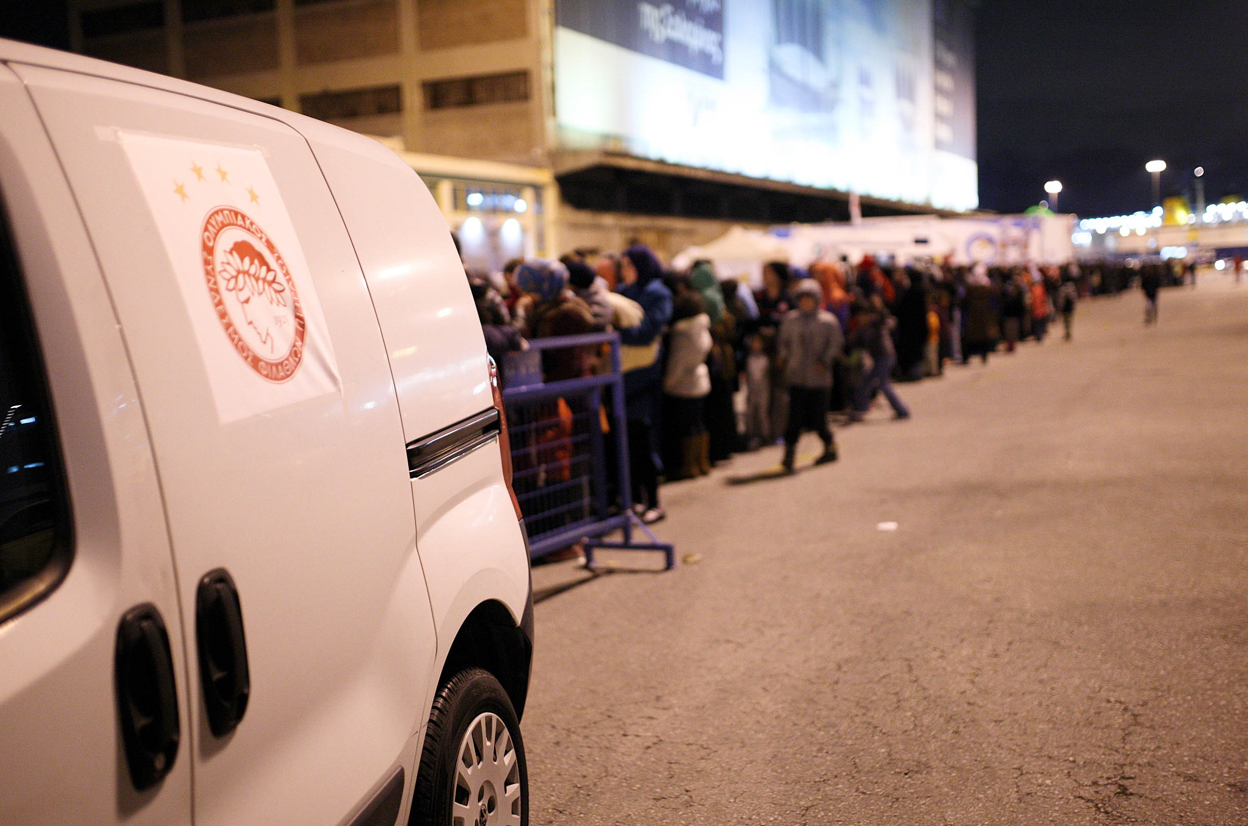 Μέχρι και περίπου στις 21.30 απόψε τα βαν αγάπης του Ολυμπιακού ήταν στις πύλες του λιμανιού του Πειραιά και μοίραζαν φαγητό και ρούχα στους ταλαιπωρημένους πρόσφυγες. Χιλιάδες, δίχως υπερβολή, μερίδες φαγητού (αφού μέρα με τη μέρα αυξάνονται και οι ανάγκες) μοιράστηκαν στους ανθρώπους που δοκιμάζονται σωματικά και ψυχολογικά.