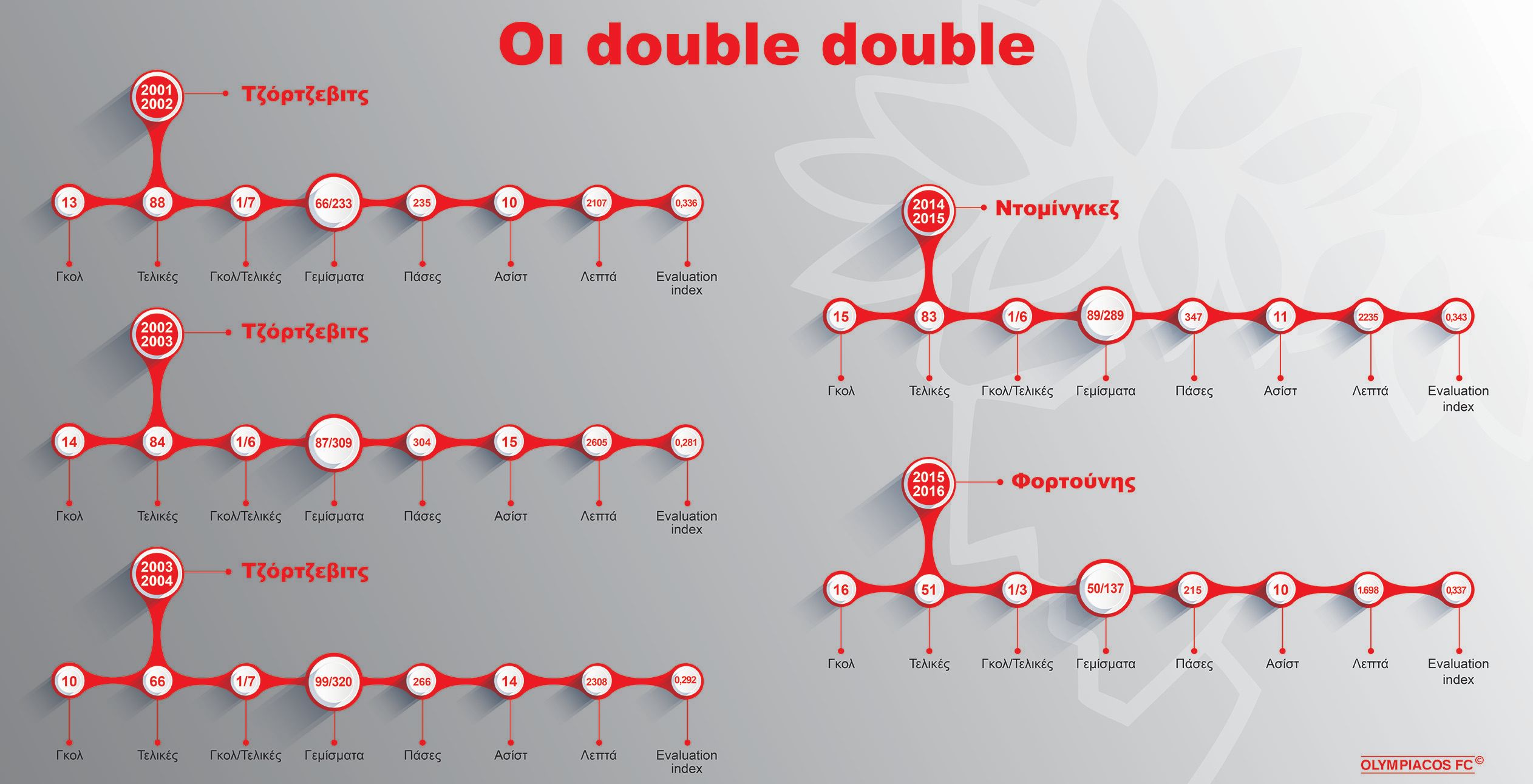 ** Η αναζήτηση για τους double double άρχισε από τη σεζόν 1998/99, όταν και μπήκαν για τα καλά στη ζώη μας τα στατιστικά με τη βοήθεια της επίσημης στατιστικής υπηρεσίας του πρωταθλήματος.