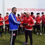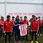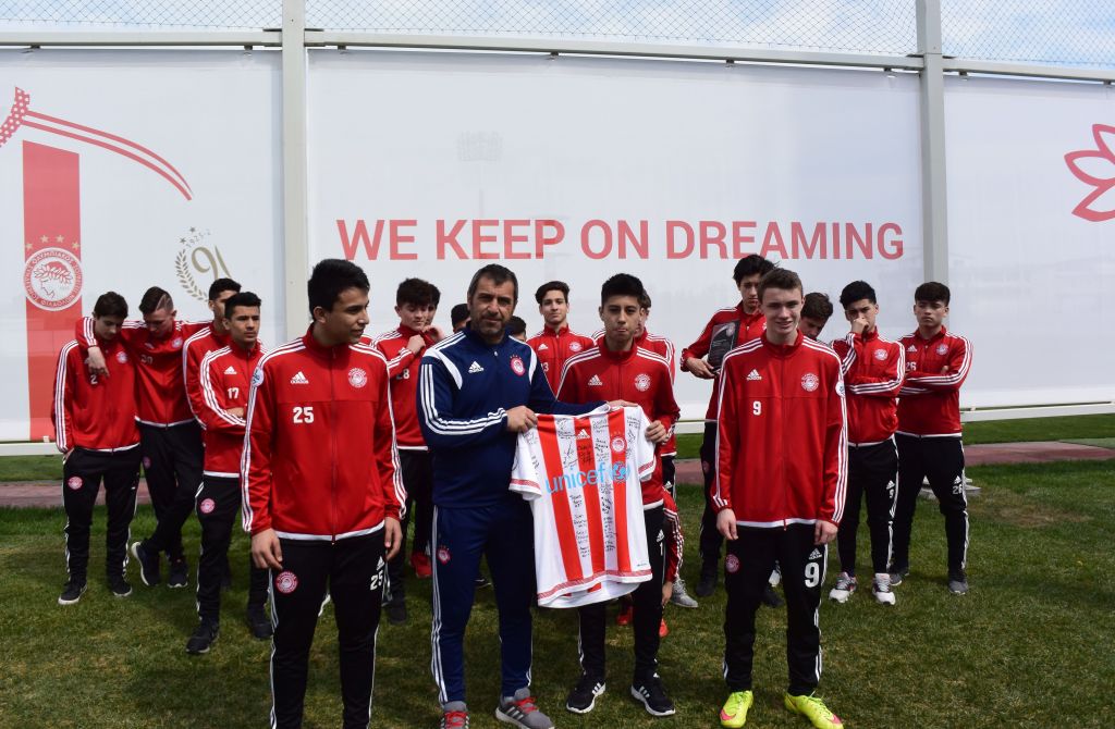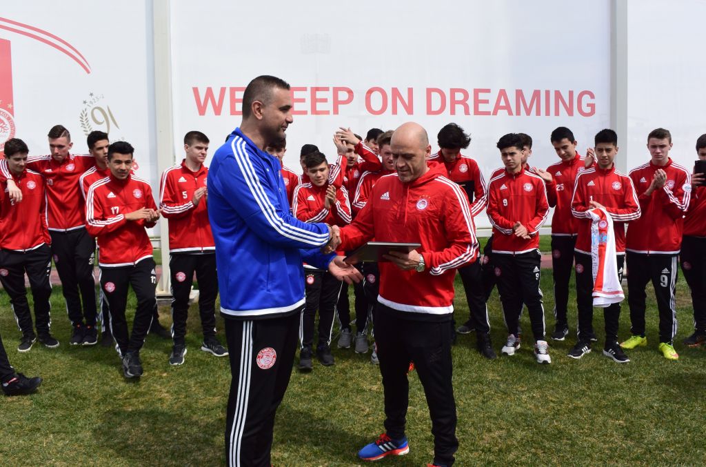 Ο επικεφαλής της Σχολής κ. Κοσμάς έδωσε δώρα για όλα τα παιδιά της Ακαδημίας και δήλωσε συγκινημένος από την εκδήλωση: “Είμαστε υπερήφανοι που είμαστε στην οικογένεια του Ολυμπιακού. Ενός τόσο μεγάλου συλλόγου που η φήμη του έχει φτάσει παντού. Ευχαριστούμε για την αγάπη σας και την φιλοξενία”