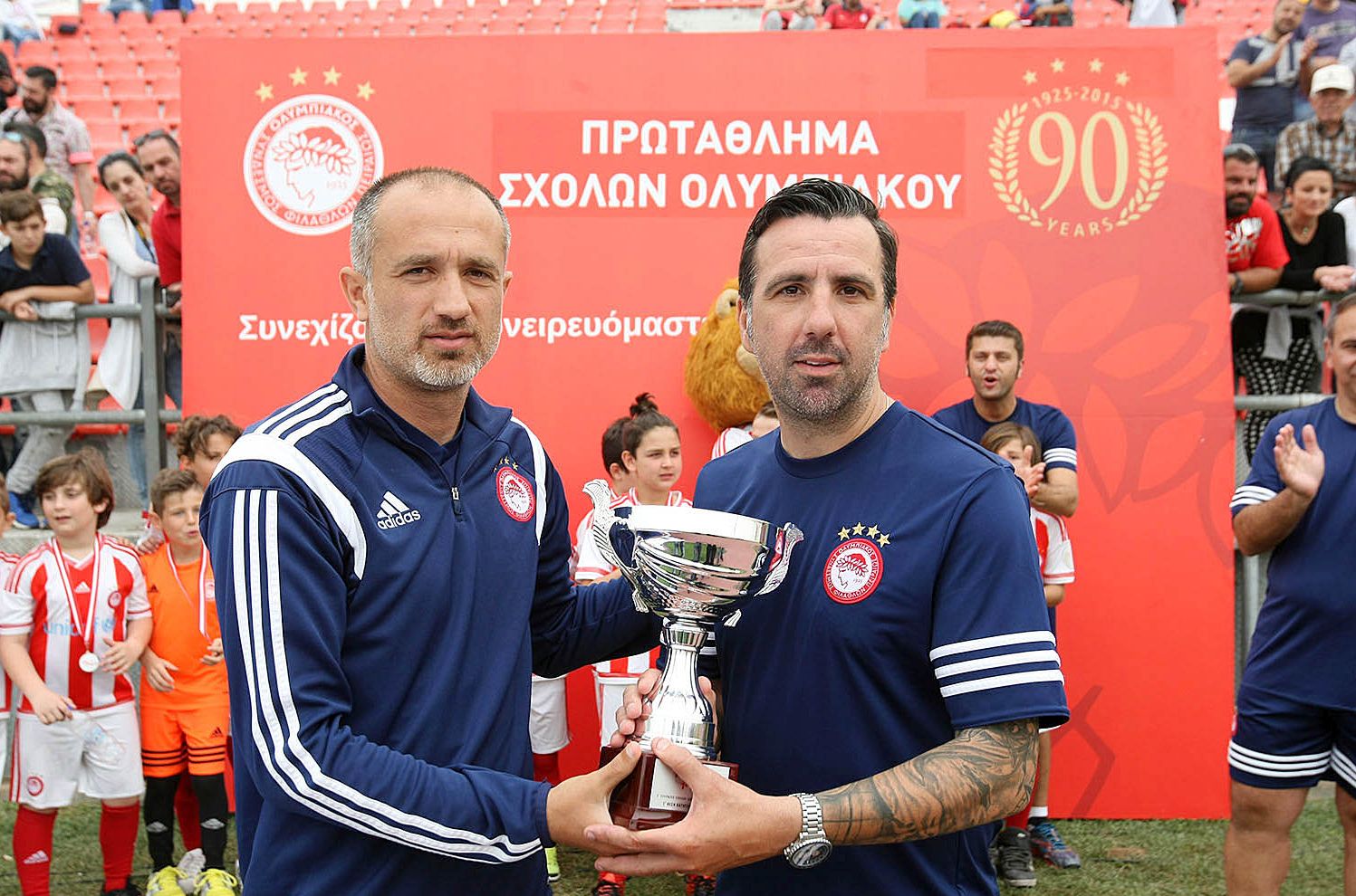 Το Πρωτάθλημα Σχολών 2015-16 τίμησαν με την παρουσία τους οι ποδοσφαιριστές της πρώτης ομάδας του Ολυμπιακού, Μπράουν Ιντέγε, Σεμπά, Ερνάνι, Τσόρι Ντομίνγκεζ, Πραξιτέλης Βούρος και Λευτέρης Χουτεσιώτης ενώ “δίπλα”στα παιδιά βρέθηκαν οι παλαίμαχοι άσοι και προπονητές της Ακαδημίας, Γιώργος Αμανατίδης, Φώτης Στρακόσια, Δημήτρης Μαυρογενίδης, Τάσος Πάντος, Βασίλης Βούζας, Σωκράτης Κοψαχείλης αλλά και οι Κούλης Καραταϊδης, Γιώργος Βαϊτσης, Ηλίας Σαββίδης και Ίλια Ίβιτς.