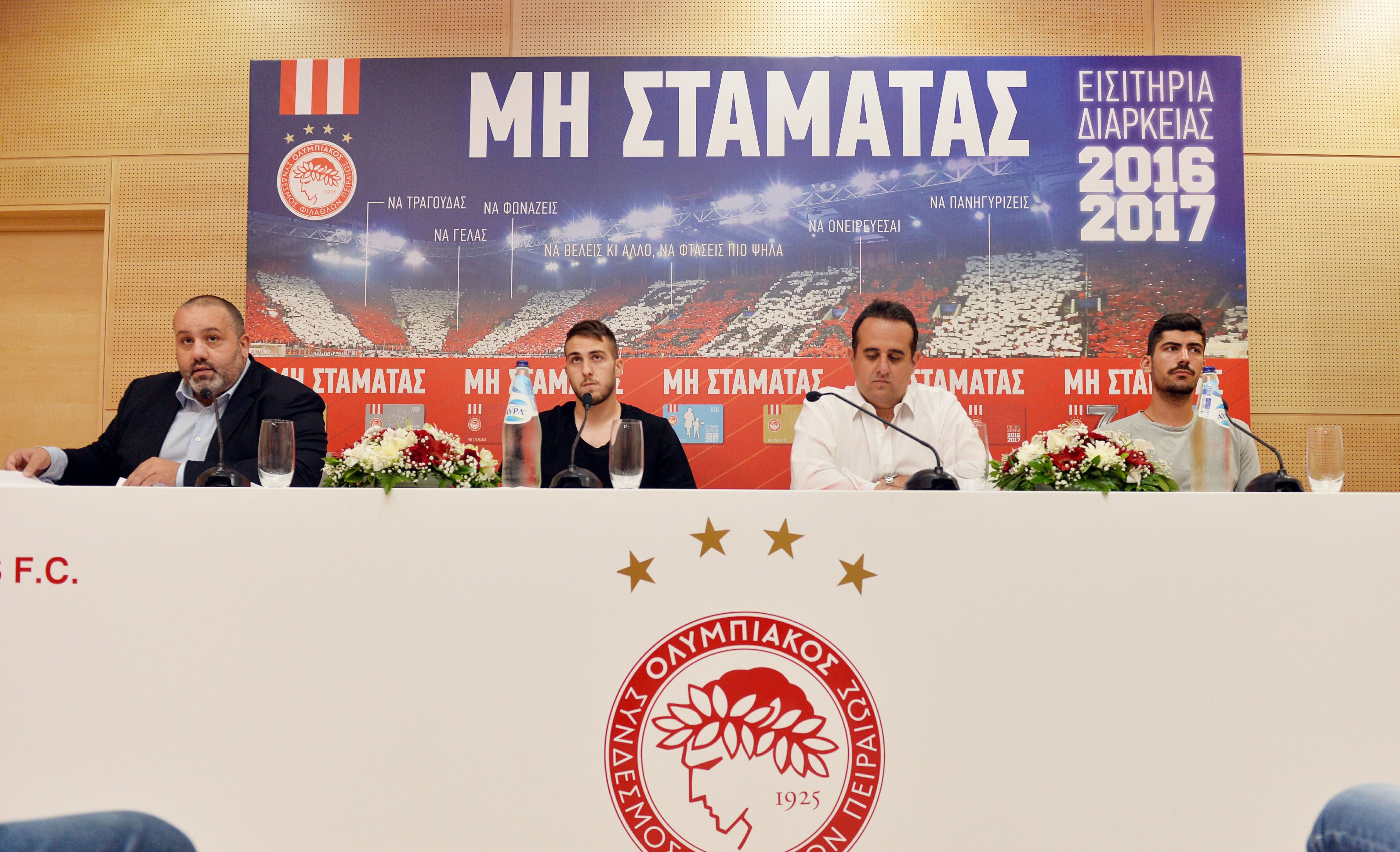 Όσον αφορά στα εισιτήρια διαρκείας, παρότι πέρυσι η ΠΑΕ Ολυμπιακός οδηγούμενη και από τις συνθήκες που επικρατούσαν εκείνο το καλοκαίρι στη χώρα μας, προχώρησε σε πολύ σημαντικές μειώσεις και τα εισιτήρια διαρκείας έγιναν ελκυστικά και προσιτά για τον κάθε φίλαθλο του Ολυμπιακού, αποφασίσαμε να διατηρήσουμε και φέτος την ίδια τιμολογιακή πολιτική και να μην προχωρήσουμε σε καμία αύξηση στις τιμές των εισιτηρίων διαρκείας επειδή θέλουμε ο κόσμος να είναι τόσο κοντά όπως είναι πάντα. Αυτό θα δίνει τη δυνατότητα σε όλους τους φιλάθλους μας είναι κοντά στην ομάδα όχι μόνο αγοράζοντας ένα εισιτήριο διαρκείας που εξασφαλίζει την πρόσβαση στο ασφαλέστερο, ομορφότερο και πιο φιλικό για την οικογένεια και τον φίλαθλο γήπεδο στην Ελλάδα. Μας ενδιαφέρει πραγματικά να βρίσκονται σε κάθε αγώνα δίπλα στην ομάδα. Σ’ αυτό το σημείο θα ήθελα να αναφερθώ σε κάτι που παρατηρήσαμε πέρυσι. Επειδή έγινε ελκυστική η απόκτηση του εισιτηρίου διαρκείας με τις μειώσεις που κάναμε, μερικοί φίλαθλοι που το προμηθεύτηκαν δεν είχαν τακτική παρουσία στο γήπεδο. Είναι κάτι που δεν είναι καλό για την ομάδα γιατί δεσμεύεται μία θέση και δεν δίνεται η δυνατότητα σ’ έναν άλλο φίλαθλο που θέλει να έρθει να δει την ομάδα. Προβληματιστήκαμε λίγο σ’ αυτό. Σκεφτήκαμε ότι θα έπρεπε να οδηγηθούμε σε αυξήσεις τιμών αλλά καταλήξαμε ότι δεν πρέπει να ζημιωθεί απ’ αυτό η μεγάλη πλειοψηφία αυτών που ήταν παρόντες στους αγώνες του Ολυμπιακού. Όμως, μπορούμε να πούμε από τώρα για την τρέχουσα σεζόν και την επόμενη, από δω και πέρα η τιμολογιακή πολιτική στα διαρκείας θα συνδυάζονται με την συχνή παρουσία των φιλάθλων στο γήπεδο. Θα ήθελα να δώσω τον λόγο στους δύο ποδοσφαιριστές μας και να τους δώσω συγχαρητήρια για ό,τι έγινε σήμερα και να τους πω ότι πλέον η ευθύνη τους είναι πιο μεγάλη για να γίνει η ομάδα μας πιο δυνατή και να στηριχθεί σε νεαρά παιδιά και Έλληνες».