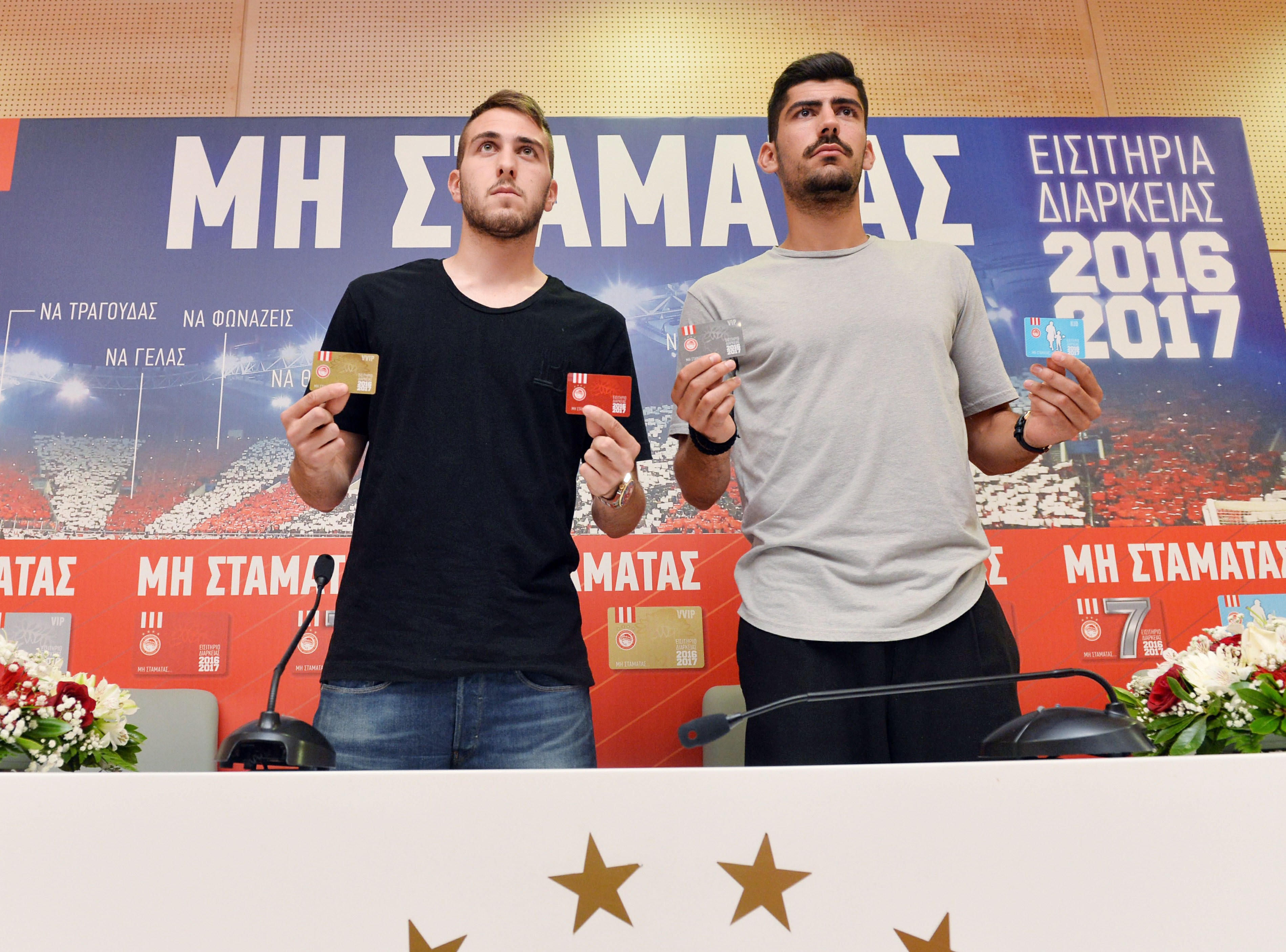 Κώστας Καραπαπάς (Διευθυντής Επικοινωνίας ΠΑΕ Ολυμπιακός): «Σας καλωσορίζουμε στην παρουσίαση των εισιτηρίων διαρκείας της ομάδας μας για τη νέα σεζόν. Είναι μαζί μας στην παρουσίαση ο διευθύνοντας σύμβουλος της ΠΑΕ Ολυμπιακός, ο κ. Γιάννης Βρέντζος, και βεβαίως δύο Έλληνες διεθνείς ποδοσφαιριστές της ομάδας μας που είναι ήδη μέρος του Θρύλου του ποδοσφαίρου και έχουν λαμπρό μέλλον μπροστά τους και στον Ολυμπιακό και στην Εθνική μας ομάδα. Ο λόγος για τον Κώστα Φορτούνη και τον Ανδρέα Μπουχαλάκη. Όπως όλοι γνωρίζετε την προηγούμενη σεζόν οι φίλαθλοί μας έσπασαν ένα μοναδικό ρεκόρ, αυτό των 21.173 εισιτηρίων διαρκείας για πρώτη φορά στην ιστορία του ασφαλέστερου, πιο σύγχρονου γηπέδου όπου και η ομάδα μας έσπασε αμέτρητα ρεκόρ. Όπως ήδη βλέπετε από τα εικαστικά της παρουσίασης το σύνθημα της καμπάνιας γι’ αυτή τη σεζόν των εισιτηρίων διαρκείας είναι το «ΜΗ ΣΤΑΜΑΤΑΣ». Είναι βγαλμένο από την εξέδρα μας, τους φιλάθλους μας, τους οπαδούς μας. Πριν περάσουμε σε μια πρώτη τοποθέτηση από τον κ. Βρέντζο να δούμε ένα βίντεο για τα διαρκείας της νέας σεζόν».