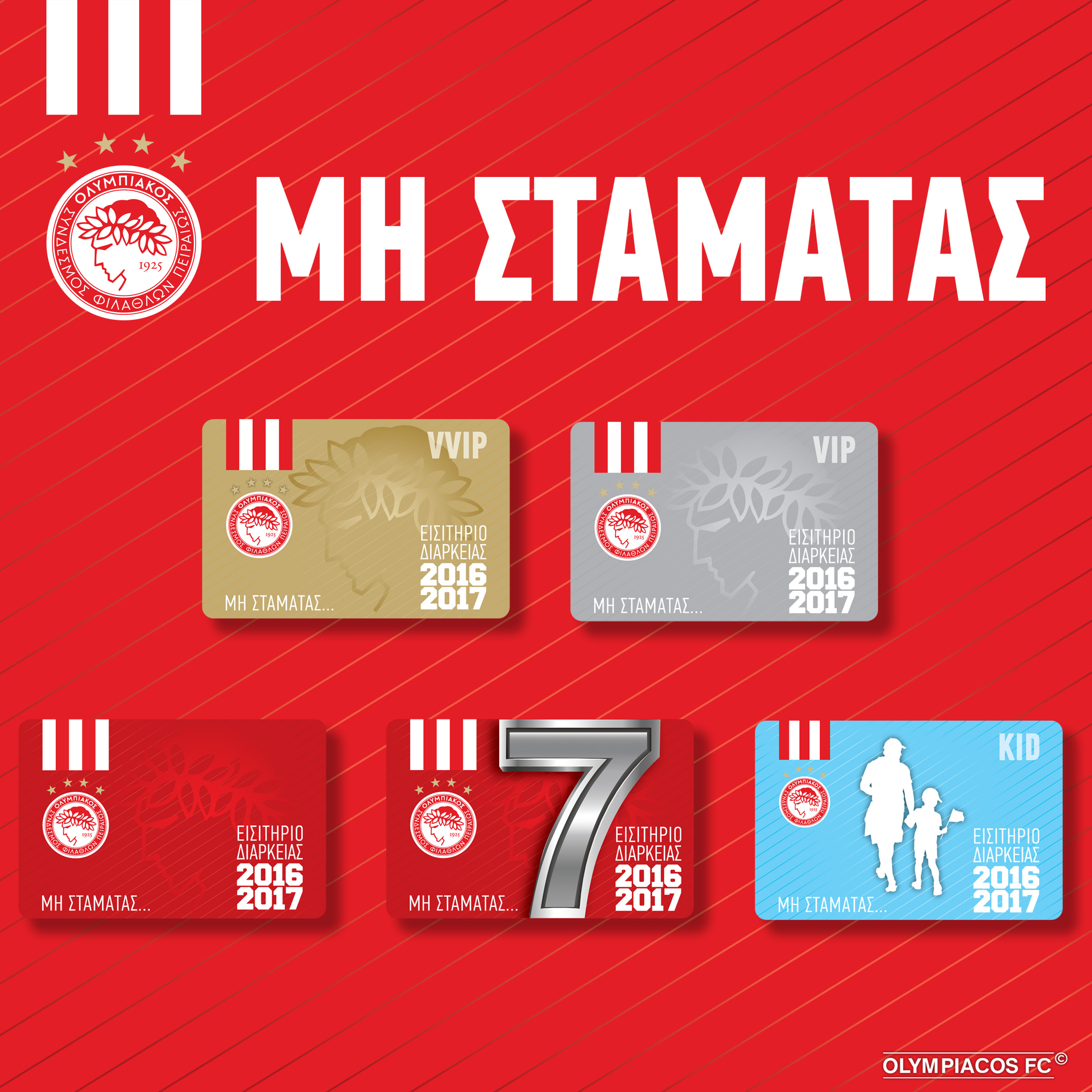 «Μη σταματάς». Μ’ αυτό το σύνθημα η ΠΑΕ Ολυμπιακός παρουσίασε σήμερα (3/6) στο «Γ. Καραϊσκάκης» τα εισιτήρια διαρκείας για τη νέα (2016/17). Είναι ένα σύνθημα που «γεννήθηκε» από τον κόσμο και τους εκφράζει όλους. Εκφράζει και τον κόσμο που δεν σταματάει να τραγουδά, να φωνάζει, να γελά, να ονειρεύεται και να πανηγυρίζει αλλά και Διοίκηση, προπονητή και παίκτες του Θρύλου μας που κάνει πάντα ό,τι μπορεί ώστε να φτάνει όλο και πιο ψηλά.