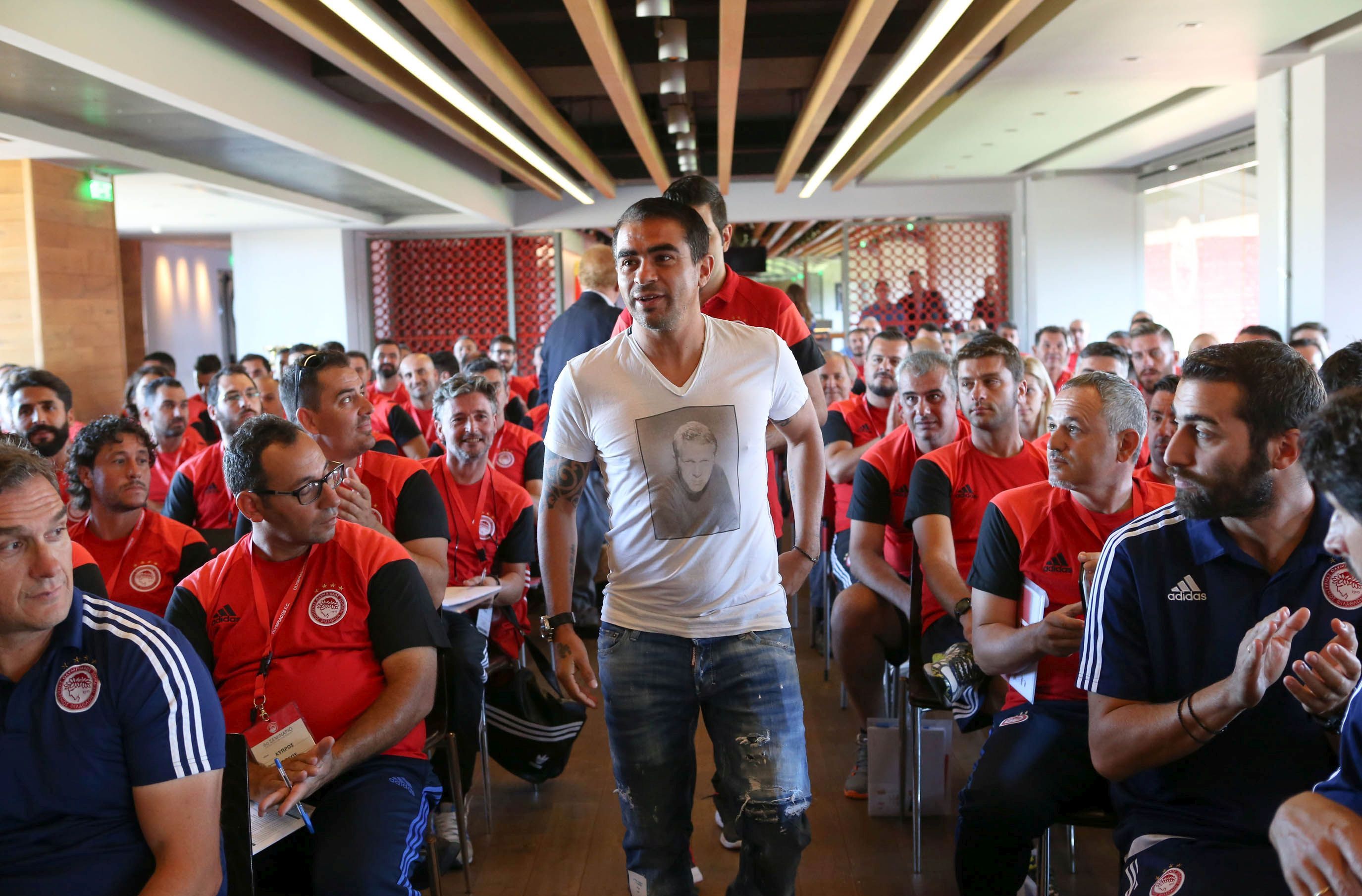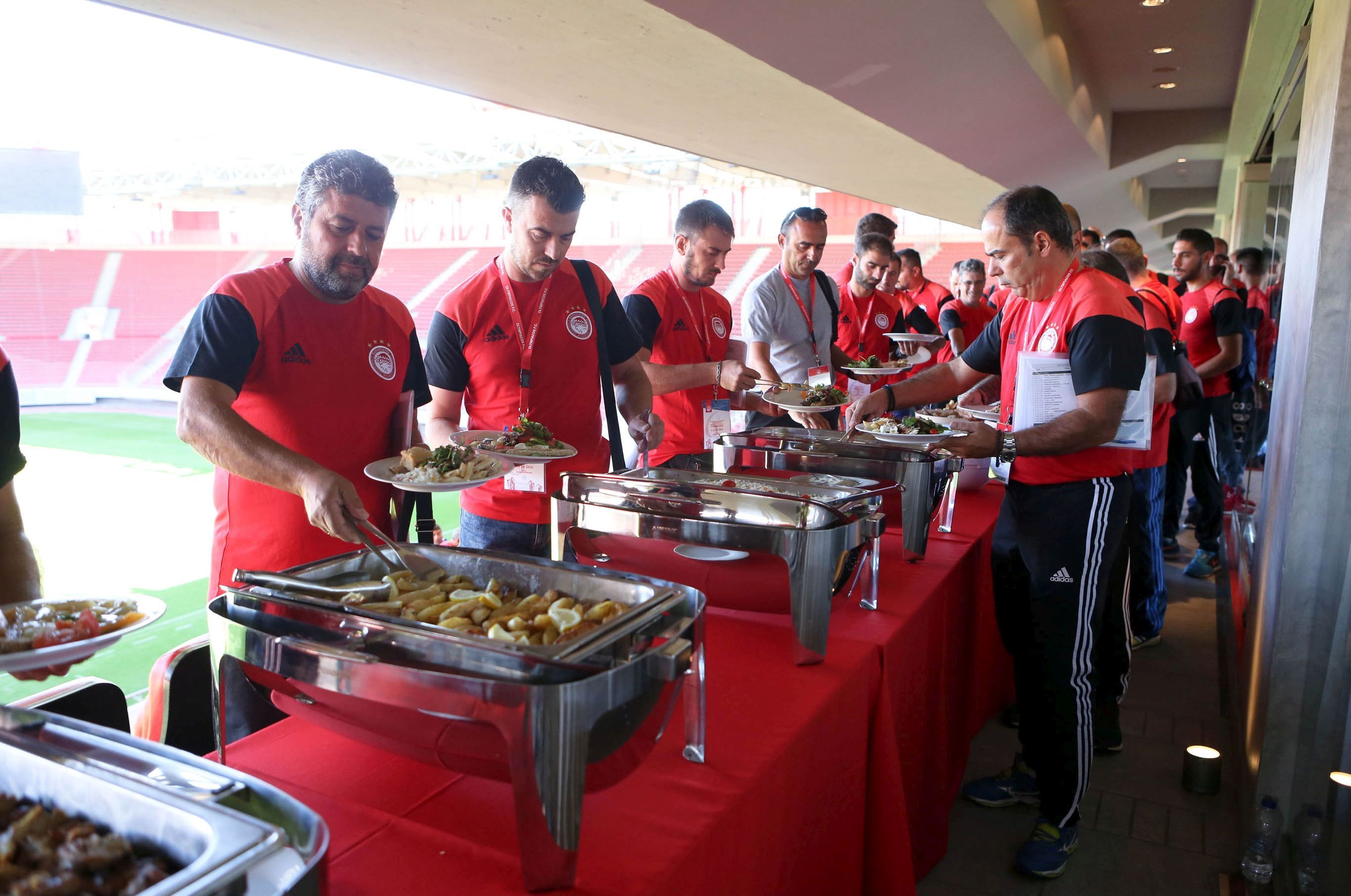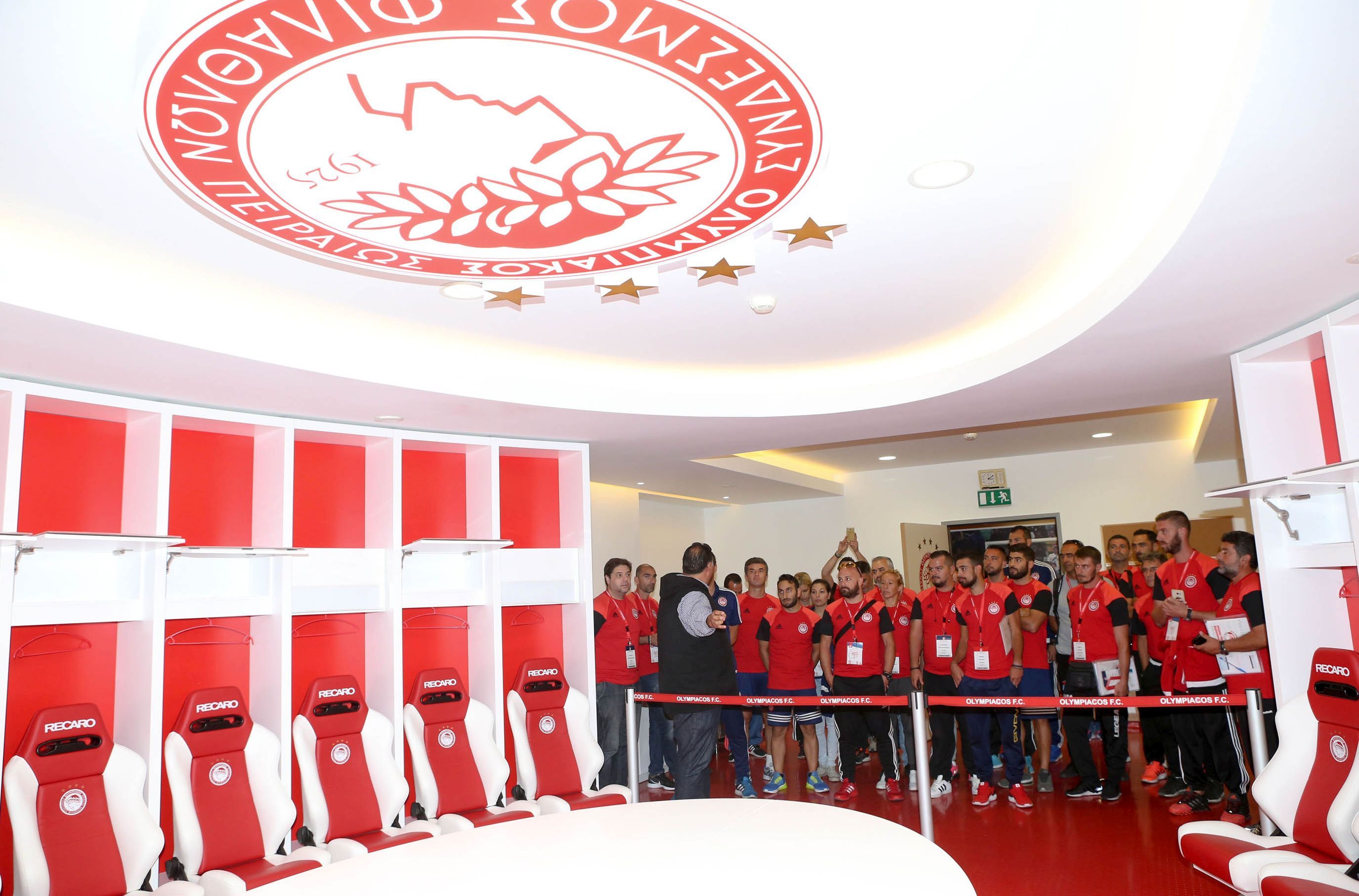 Το «Γ. Καραϊσκάκης» μαγεύει από μόνο του… Οι προπονητές και τα στελέχη όλων των Σχολών μας όταν άνοιξε η κεντρική πύλη του δεν… χόρταιναν να το βλέπουν και να το φωτογραφίζουν. Έβλεπες την ώρα του Σεμιναρίου κλεφτές… ματιές έξω στο γήπεδο, στις θύρες, στην σημαία του Ολυμπιακού που κυμάτιζε στην απέναντι πλευρά. Το μυαλό έφευγε για λίγο και συνειδητοποιούσε την πραγματικότητα. Πρώτη ομάδα, Ακαδημία, Σχολές: Μια οικογένεια. Οι προπονητές πάτησαν το χόρτο του «Γ. Καραϊσκάκης», στήθηκαν στο κέντρο για να …τους απαθανατίσει ο φωτογράφος και να περάσουν στην ιστορία. Όλοι τους είναι εκπρόσωποι του Ολυμπιακού στην περιοχή τους. Το Σεμινάριο τους έδωσε την δυνατότητα να ξεναγηθούν από τον Διευθυντή Εταιρικής Επικοινωνίας και ΕΚΕ της ΠΑΕ Ολυμπιακός κ. Κωνσταντίνο Καρδιασμένο στα αποδυτήρια, στο στούντιο, στην αίθουσα Τύπου και σ’ άλλους εσωτερικούς χώρους του «Γ. Καραϊσκάκης». Φυσικά στο μεσημεριανό διάλλειμα όλοι όσοι συμμετείχαν στο Σεμινάριο είχαν την ευκαιρία να γευματίσουν στο “Vammos”.