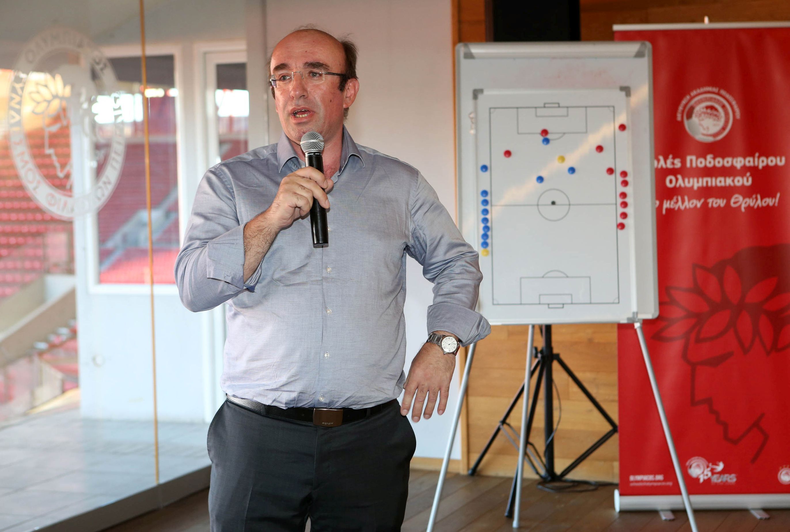 Το ποδόσφαιρο είναι δύναμη, αντοχή αλλά είναι και τακτική. Οι ειδικοί σ’ αυτό το θέμα, οι προπονητές της Ακαδημίας του Ολυμπιακού μίλησαν στους προπονητές των Σχολών για θέματα τακτικής και προπόνησης. Ο τεχνικός της Κ-20 Βασίλης Βούζας ανέλυσε το θέμα «Μοντέλο Προπόνησης», ο προπονητής της Κ-17 κ. Δημήτρης Μαυρογενίδης μαζί με τον προπονητή της Κ-15 κ. Νίκο Τοπολιάτη ανέλυσαν το θέμα «Επιθετική Λειτουργία Δυο Γραμμών» ενώ ο τεχνικός της Κ-16 κ. Τάσος Θέος ασχολήθηκε στην παρουσίαση του με τις στατικές φάσεις. Οι προπονητές της Ακαδημίας δέχτηκαν δεκάδες ερωτήσεις και ικανοποίησαν με τις απαντήσεις τους και τον απαιτητικό συνάδελφο τους από το Δίκτυο Σχολών.
