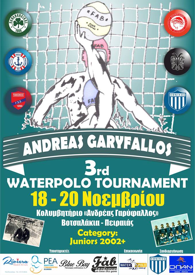 Πρεμιέρα σήμερα για το 3ο τουρνουά πόλο «Ανδρέας Γαρύφαλλος», για παιδιά γεννηθέντα το 2002+ στο οποίο συμμετέχουν, οι παίδες του Ολυμπιακού και οι αντίστοιχες ομάδες του Εθνικού (ο οποίος είναι συνδιοργανωτής του τουρνουά, μαζί με τον ΟΠΑΝ), του Πανιωνίου, της Βουλιαγμένης, του ΠΑΟΚ και του Παναθηναϊκού.