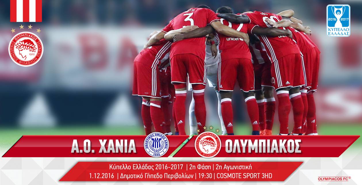 Τη νίκη με την οποία θα εξασφαλίσει την πρόκριση στην επόμενη φάση του Κυπέλλου Ελλάδας θέλει απόψε (19:30 – COSMOTE SPORT 3 HD) ο Ολυμπιακός που φιλοξενείται στο δημοτικό γήπεδο Περιβολίων της Κρήτης από τα Χανιά. Ο αγώνας διεξάγεται στο πλαίσιο της 2ης αγωνιστικής του 2ου ομίλου της διοργάνωσης με τον Θρύλο να είναι επικεφαλής του ομίλου με 3 βαθμούς χάρη στη νίκη του επί του Πλατανιά με 3-0 την 1η αγωνιστική στο «Γ. Καραϊσκάκης». Από 3 βαθμούς είναι η συγκομιδή και των ομάδων του Πλατανιά και της Σπάρτης ωστόσο έχουν ήδη από 2 αγώνες έκαστη. Τα Χανιά είναι στην 4η θέση με 0 βαθμούς και απόψε δίνουν επίσης, απέναντι στον Θρύλο, το 2ο παιχνίδι τους.