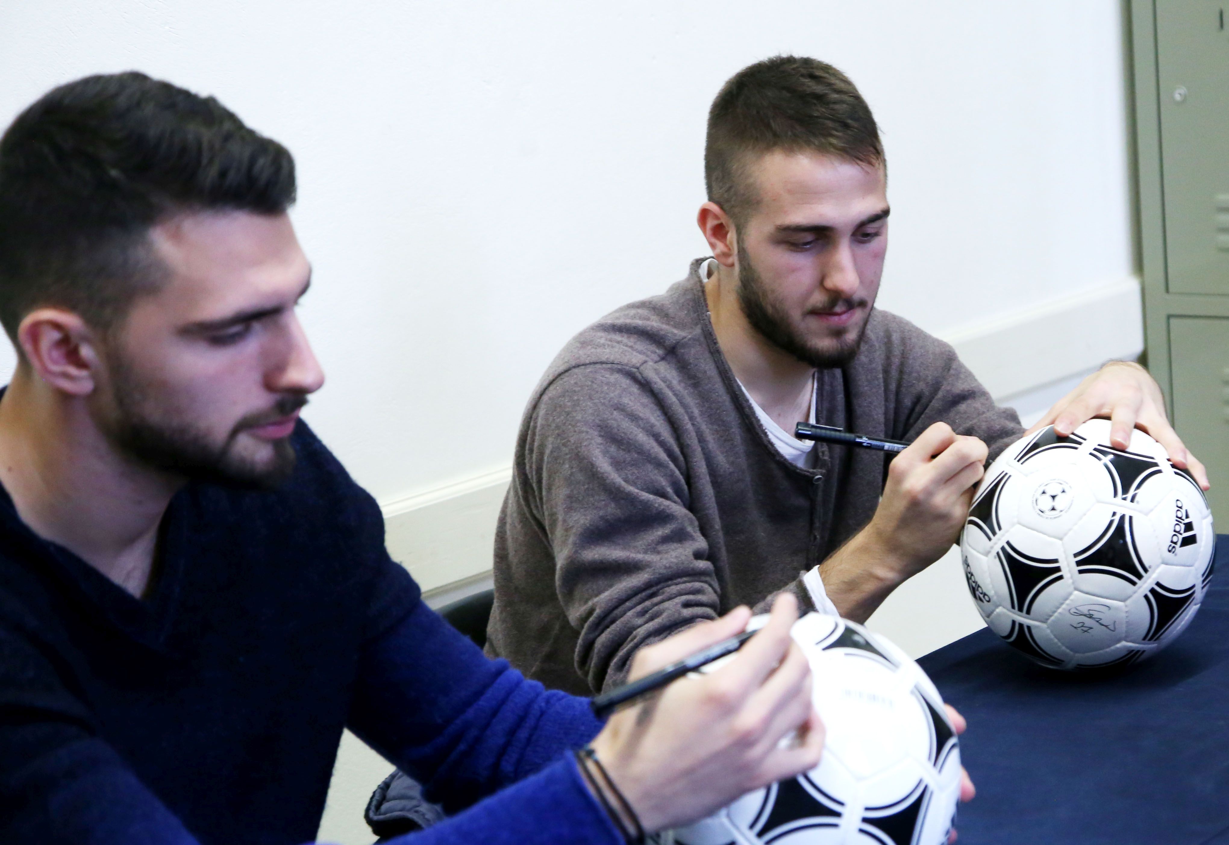 Οι δύο ποδοσφαιριστές μας υπέγραψαν πάνω σε 100 μπάλες που προμηθεύτηκαν οι μικροί θαυμαστές τους και χάρη σ’ αυτή τη διαδικασία συγκεντρώθηκε ένα ποσό για την ενίσχυση του Ταμείου των Υποτροφιών. Εννοείται πως δεν χάλασαν χατίρι σε κανέναν υπογράφοντας και σε μπλούζες, καπέλα ενώ έβγαλαν φωτογραφίες με όλα τα παιδιά.