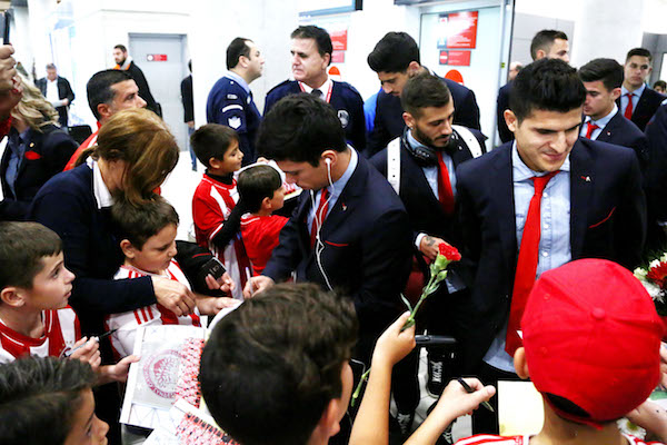 Εκεί την περίμενε πλήθος κόσμου, ενήλικες, αλλά και μικρά παιδιά, από τις Σχολές του Ολυμπιακού! Η υποδοχή ήταν ιδιαίτερα ζεστή, με φωνές, συνθήματα και φυσικά την ιαχή «ΟΛΥΜΠΙΑΚΟΣ! ΟΛΥΜΠΙΑΚΟΣ!» να δονεί το αεροδρόμιο της Λάρνακας. Οι παίκτες και το προπονητικό τιμ της ομάδας μας υπέγραψαν πάμπολλα αυτόγραφα και έβγαλαν ακόμη περισσότερες φωτογραφίες, έως ότου φτάσουν στην έξοδο και επιβιβαστούν στο πούλμαν, το οποίο θα τους μετέφερε στο ξενοδοχείο.