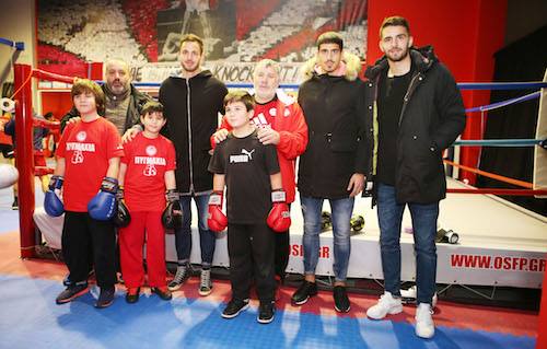 Οι τέσσερις αθλητές είχαν την ευκαιρία να περιηγηθούν στις υπερσύγχρονες εγκαταστάσεις άθλησης των Τμημάτων Πολεμικών Τεχνών, τα οποία έχουν δημιουργηθεί χάρη στον Πρόεδρο της ΠΑΕ Ολυμπιακός, κ. Βαγγέλη Μαρινάκη. Τους τέσσερις παίκτες συνόδευε ο Διευθυντής Επικοινωνίας της ΠΑΕ Ολυμπιακός, κ. Κώστας Καραπαπάς, ο οποίος μίλησε για τη συγκεκριμένη επίσκεψη, αλλά και για τη σημασία που έχουν αυτά τα Τμήματα για τον Σύλλογό μας:
