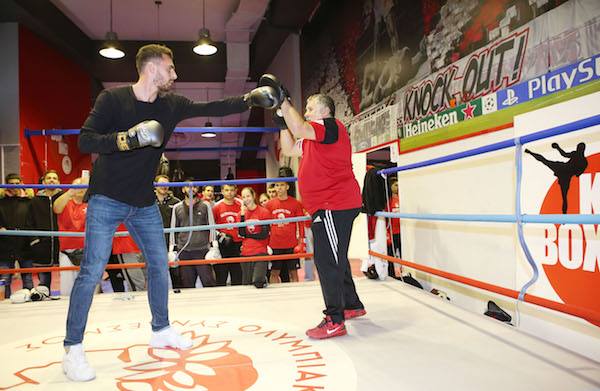 Οι ποδοσφαιριστές του Θρύλου ανέβηκαν και στο ρινγκ, με τον προπονητή πυγμαχίας, Λευτέρη Λειβάδη και είχαν την ευκαιρία να «παίξουν» μαζί του και να πάρουν μία γεύση, από προπόνηση πυγμαχίας! Καπίνο και Λεάλι έδειξαν να το απολαμβάνουν ιδιαιτέρως, να διασκεδάζουν, αλλά παράλληλα και να κατανοούν πόσο δύσκολο είναι το σπορ της πυγμαχίας! Και οι τέσσερις «ερυθρόλευκοι» άσοι πέρασαν και από το Τμήμα Κικ-Μπόξινγκ, αλλά και από εκείνο του Τάε Κβον Ντο και είχαν την ευκαιρία να δουν από κοντά τα παιδιά εν ώρα εκγύμνασης!