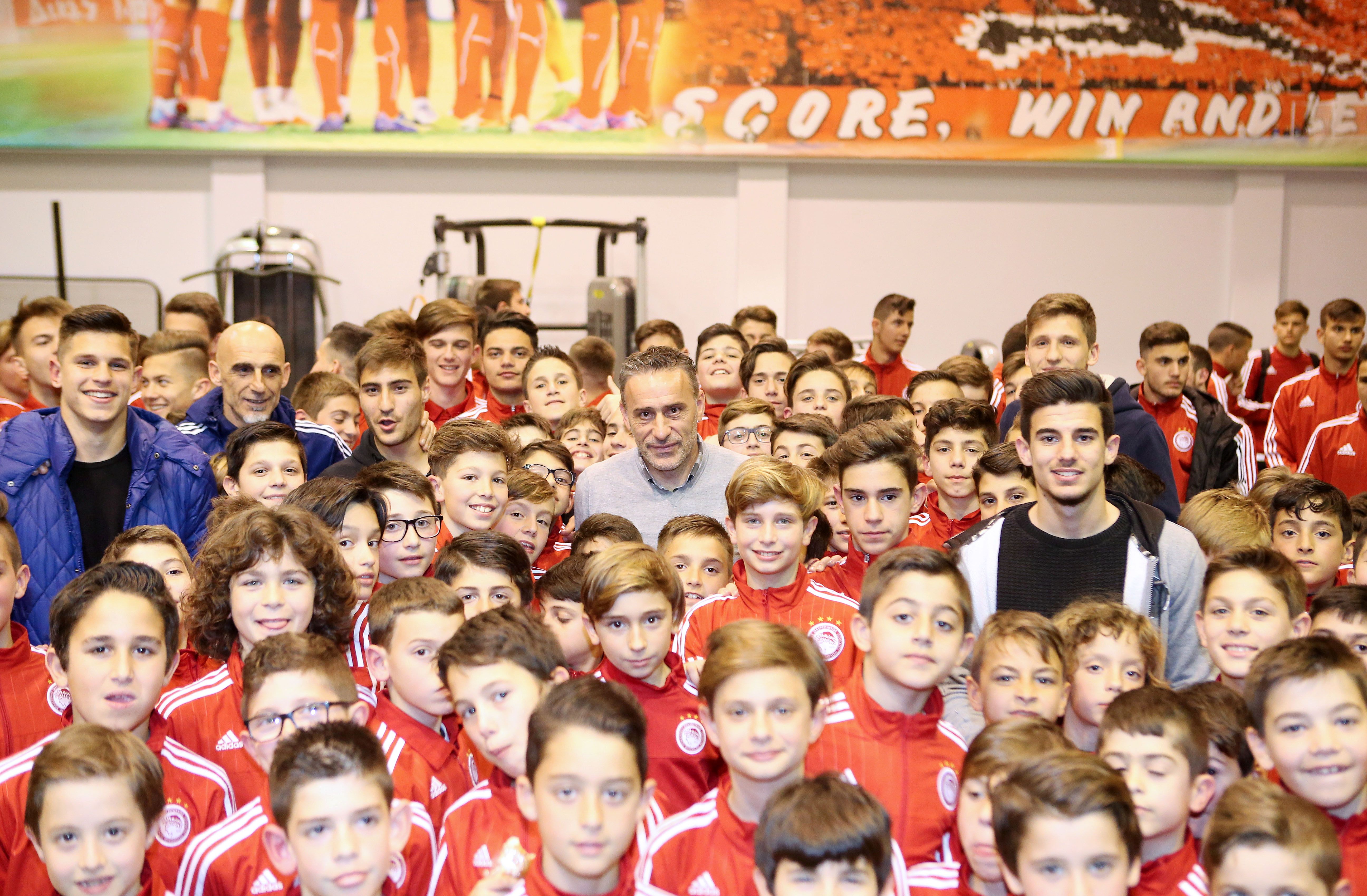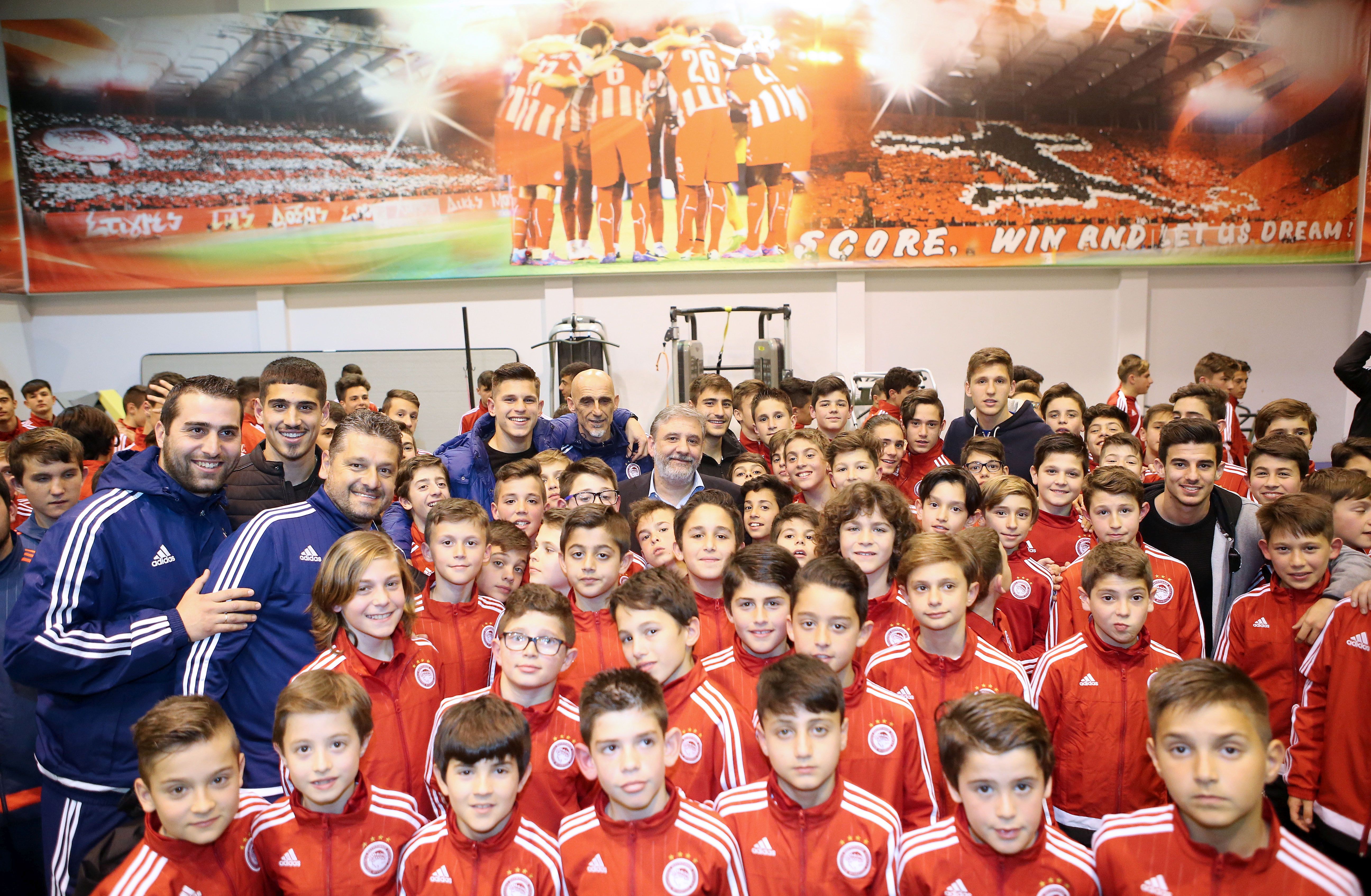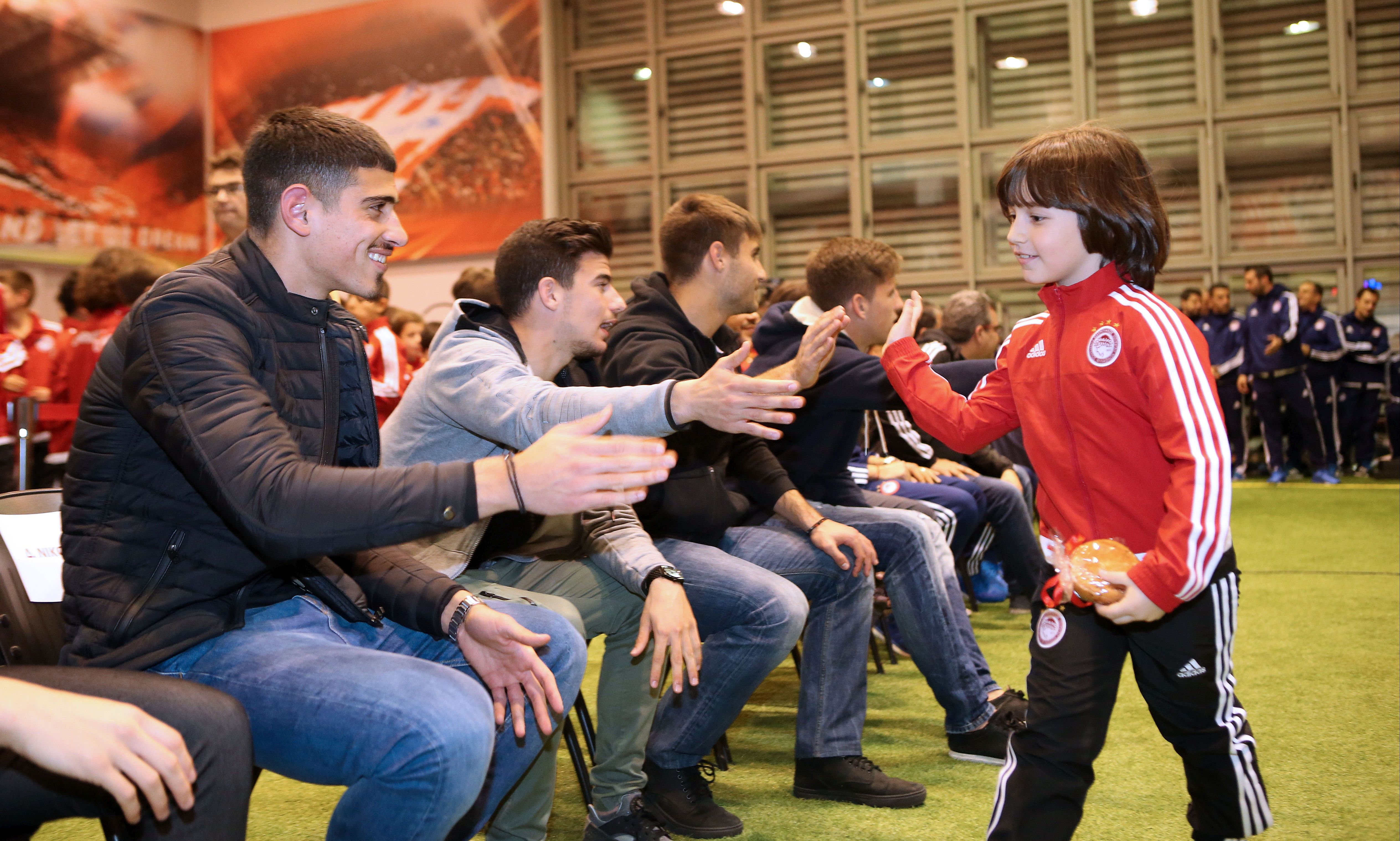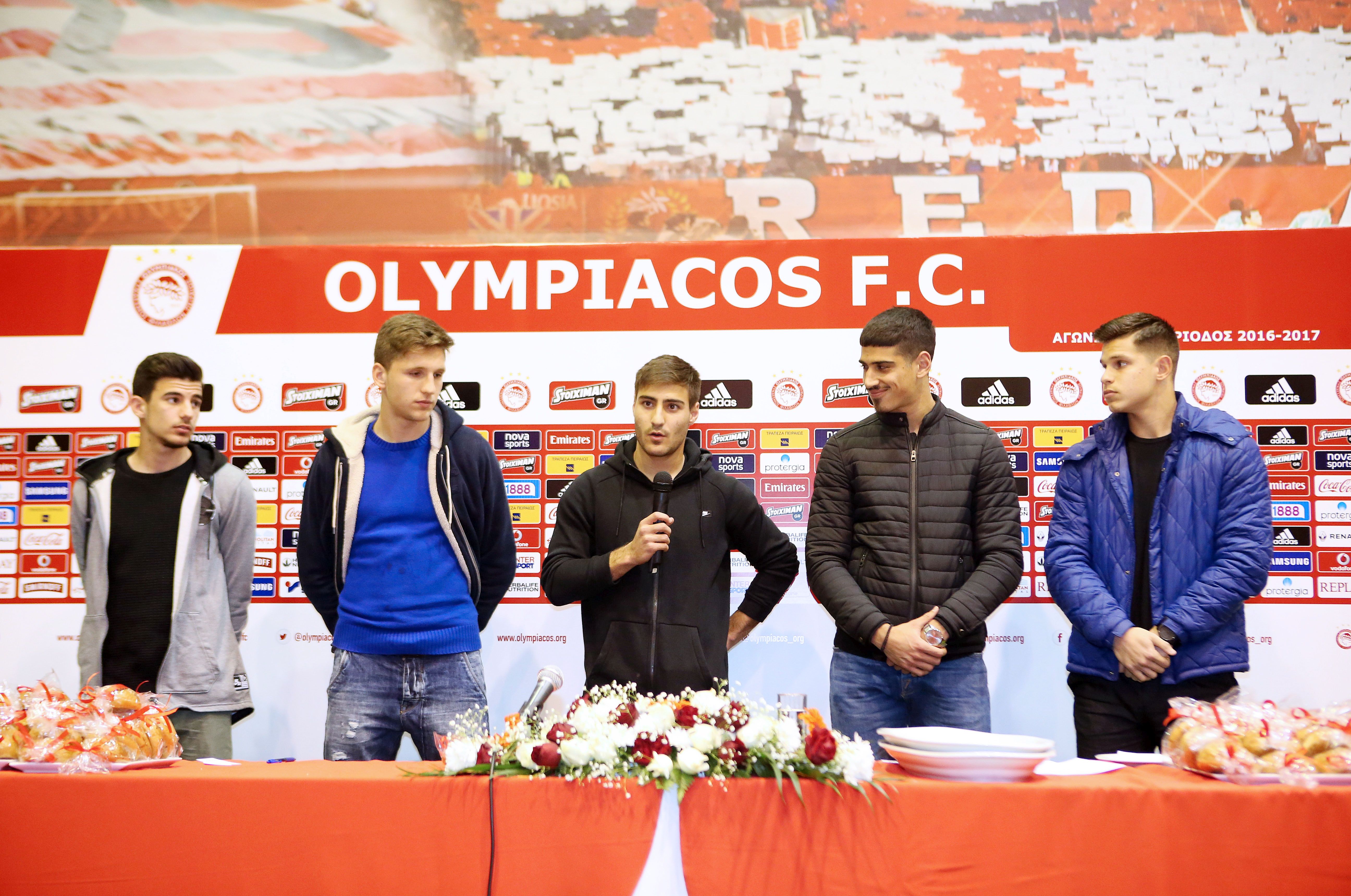 Ο Θανάσης Ανδρούτσος είπε: «Εύχομαι καλή χρονιά με υγεία σ’ όλους. Θέλω να πω ότι δεν πρέπει να σταματάτε να έχετε όνειρα. Ήμασταν και εμείς εδώ. Ν’ ακούτε τους προπονητές σας, να κοιτάτε το σχολείο και προοδεύτετε». Ο Παναγιώτης Ρέτσος σημείωσε: «Είμαστε πολύ χαρούμενοι που είμαστε εδώ μαζί σας. Φέτος έχουμε την τύχη και την τιμή να παίζουμε στην μεγάλη ομάδα του Ολυμπιακού. Μας βοηθήσατε εσείς και φυσικά ο προπονητής και ο Πρόεδρος που μας στηρίζει συνεχώς. Έχουμε περάσει πολύ ωραίες στιγμές στην Ακαδημία και χαρές και λύπες. Απο αυτά μάθαμε. Υγεία σ’ όλους σας». Ο Δημήτρης Νικολάου είπε: «Καλή χρονιά σ΄ όλους σας. Το πιο σημαντικό είναι να έχουμε την υγεία μας. Είχαμε όνειρο να παίξουμε στην μεγάλη ομάδα του Ολυμπιακού και τα καταφέραμε. Γι’ αυτο και εσείς να ακολουθείτε τ’ όνειρα σας». Ο Δημήτρης Σκαφίδας σημείωσε: «Είναι μεγάλη τιμή και ευλογία να προπονούμαι στην πρώτη ομάδα. Ονειρεύομαι και εγώ όπως και εσείς την πρώτη μου συμμετοχή στην ομάδα. Καλή χρονιά και πολλές επιτυχίες σ’ όλους σας».