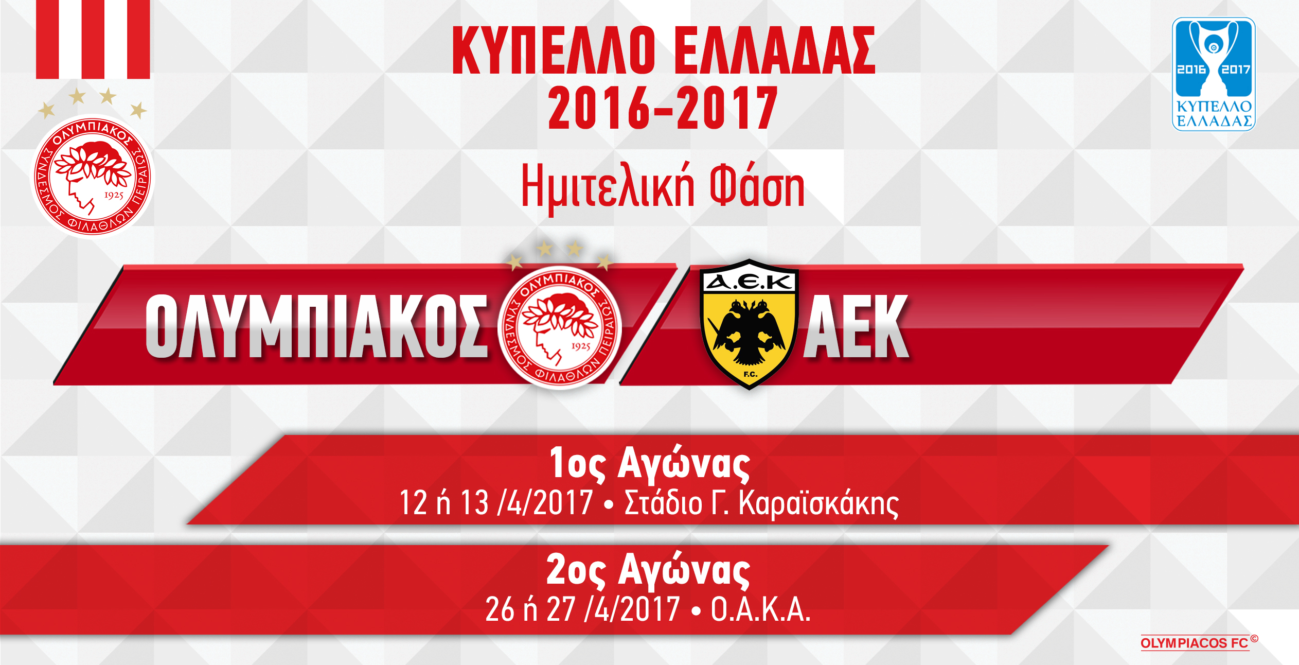 Μεγάλος στόχος του Ολυμπιακού παραμένει και η κατάκτηση του Κυπέλλου, προκειμένου να τη συνδυάσει με την κατάκτηση του πρωταθλήματος και να φτάσει σε ένα ακόμη νταμπλ. Η κλήρωση για τα ημιτελικά του θεσμού διενεργήθηκε το πρωί της Τρίτης, 21/3 και έφερε στον δρόμο του Θρύλου την ΑΕΚ. Παναθηναϊκός και ΠΑΟΚ, όπως είναι φυσιολογικό, απαρτίζουν το έτερο ζευγάρι της τετράδας.