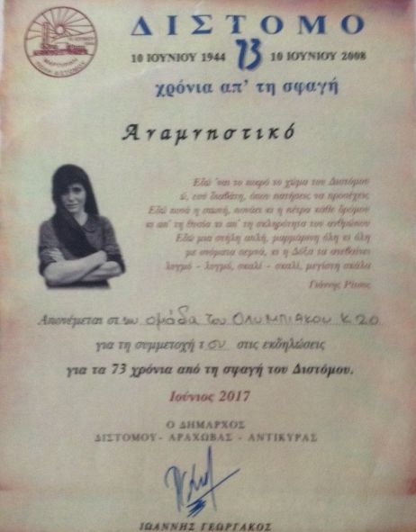 Ο τεχνικός της Κ-20 του Ολυμπιακού Βασίλης Βούζας σε δηλώσεις του για την επίσκεψη στο Δίστομο σημείωσε: “Ήταν μεγάλη η τιμή και για εμάς που ήρθαμε εδώ στο μαρτυρικό Δίστομο για να γιορτάσουμε την άνοδο της τοπικής ομάδας στην Γ’ εθνική κατηγορία. Τα παιδιά και εμείς συγκλονιστήκαμε μ’ αυτά που είδαμε στο μουσείο και με τις μαρτυρίες. Ελπίζουμε να μην γίνουν σε κανέναν άλλο τόπο παρόμοια εγκλήματα. Ευχαριστούμε θερμά για την φιλοξενία και ευχόμαστε καλή επιτυχία στον Αμβρυσσέα”.