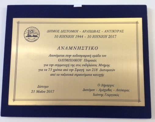 Στο πλαίσιο της επίσκεψης οι ποδοσφαιριστές και το τεχνικό επιτελείο του Ολυμπιακού τιμήθηκαν από τις τοπικές αρχές και την ομάδα ενώ επισκέφτηκαν και το Μουσείο Θυμάτων Ναζισμού Διστόμου.
