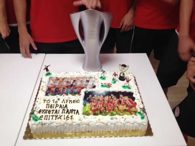 Η τεράστια τούρτα είχε φωτογραφίες των δυο ομάδων που κατέκτησαν τα Πρωταθλήματα και ευχές για νέες επιτυχίες στο μέλλον από το 10ο Λύκειο Πειραιά.