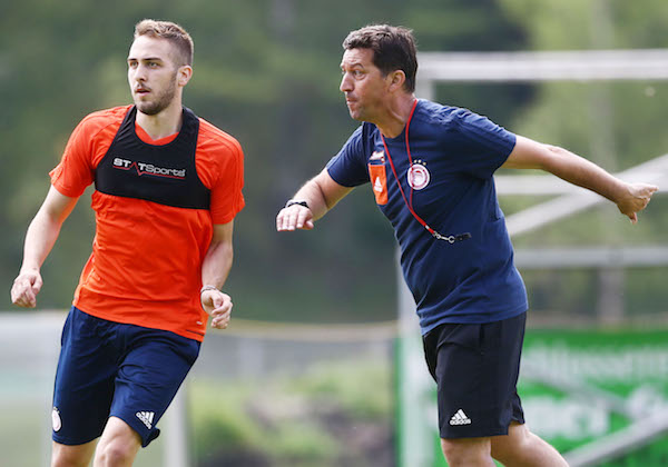 Για τον αριθμό των παικτών που χρειάζεται: Θα εξαρτηθεί αυτός ο αριθμός από το είδος των ποδοσφαιριστών που θα έχω στη διάθεσή μου. Θα ήθελα να δουλέψω με 23-24 ποδοσφαιριστές και τέσσερις τερματοφύλακες. Τότε θα μπορώ να δουλέψω καλύτερα και την τακτική, κάτι που θα κάνουμε στο δεύτερο στάδιο προετοιμασίας, στο Γκενκ. Εκεί θα κάνουμε πιο εξειδικευμένα πράγματα, εδώ δουλεύουμε λίγο πιο γενικά. Στο κομμάτι της φυσικής κατάστασης. Γιατί ανακάλυψα ότι την περσινή χρονιά ο Ολυμπιακός δεν ήταν σε καλή φυσική κατάσταση. Θέλω ιδιαίτερη ένταση στο παιχνίδι μας και έτσι οι ποδοσφαιριστές μου πρέπει να είναι σε τοπ φυσική κατάσταση. Έτσι, πρέπει να δουλέψω επάνω σε αυτό το κομμάτι, αλλά παράλληλα και να περάσω ορισμένα πράγματα επάνω στην τακτική. Πράγματα τα οποία ήδη οι παίκτες μου γνωρίζουν ότι θέλω. Από τους αμυντικούς, τους μέσους και τους επιθετικούς. Θα είμαστε προετοιμασμένοι. Προέρχομαι από μία κουλτούρα με τον προηγούμενο σύλλογο μου, που είχαμε επίσης να δώσουμε 50 με 60 παιχνίδια μέσα στη χρονιά. Στο Βέλγιο έχουμε ήδη εδώ και πολύ καιρό πλέι οφ. Γνωρίζω πως είναι, το ίδιο και ο προπονητής φυσικής κατάστασης που έχουμε. Και νομίζω ότι θα είμαστε έτοιμοι. Η προετοιμασία μας είναι κατά τι διαφορετική. Και αυτό γιατί τα πιο σημαντικά παιχνίδια μας θα είναι πριν αρχίσουν καν οι διοργανώσεις. Όποτε θέλουμε να δουλέψουμε σκληρά στη φυσική κατάσταση αλλά να κρατήσουμε και την φρεσκάδα γιατί μετά τα προκριματικά θα αρχίσουν και οι διοργανώσεις μας. Και θα χρειαστεί μέχρι το τέλος να έχουμε φρεσκάδα. Γνωρίζουμε τι πρέπει να κάνουμε και θα είμαστε εντάξει.