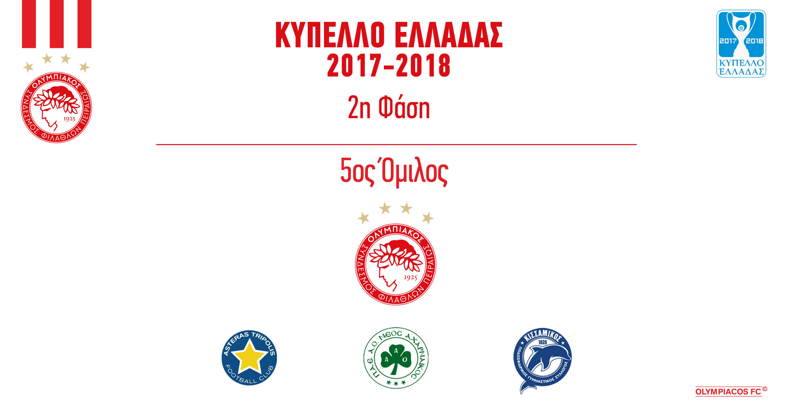 Στον5ο όμιλοτης 2ης Φάσης του Κυπέλλου Ελλάδας 2017/18 κληρώθηκε ο Ολυμπιακός μας,με αντιπάλους τον Αστέρα Τρίπολης, τον Αχαρναϊκόκαι τον Κισσαμικό.