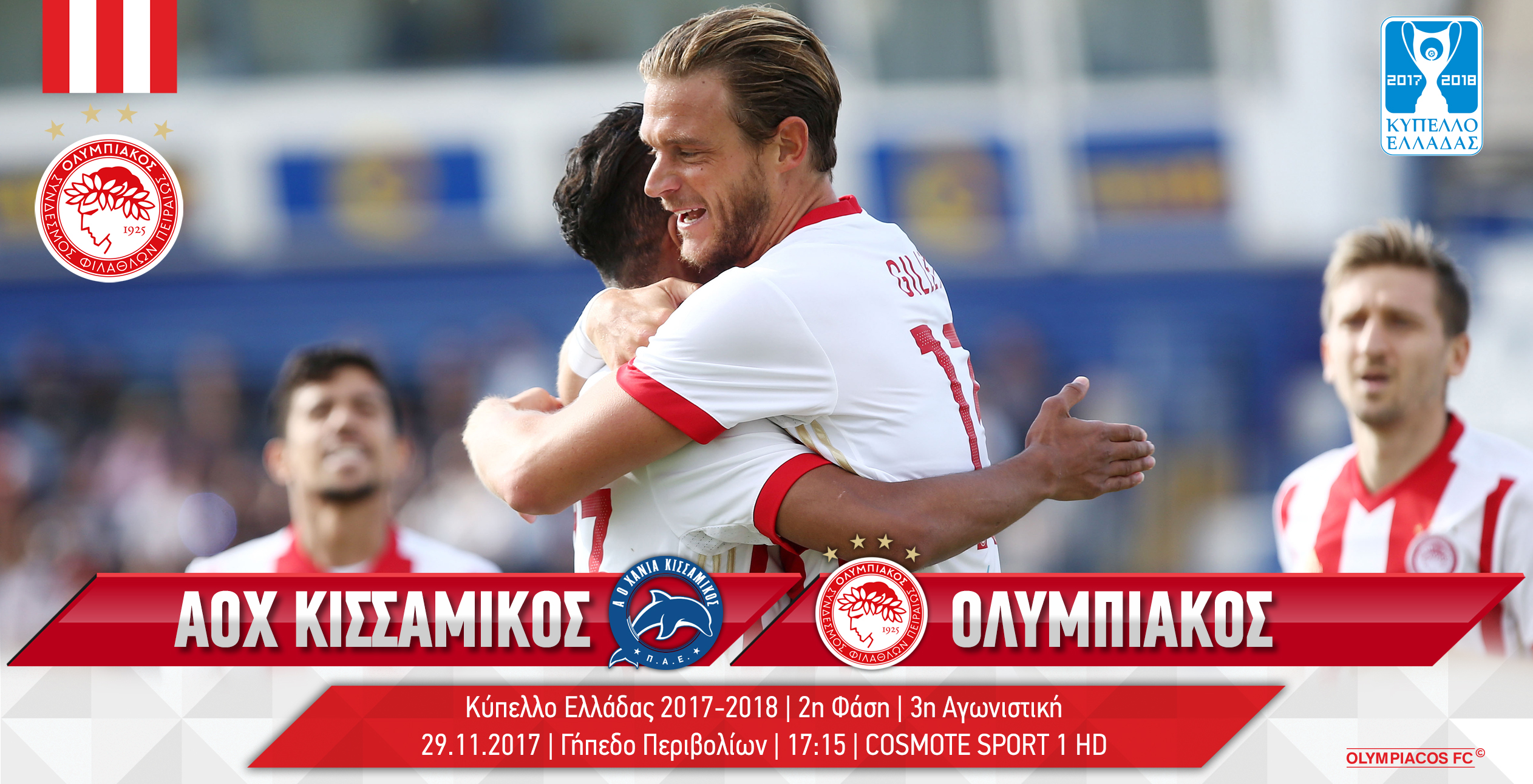 Στην τρίτη και τελευταία αγωνιστική της 2ης φάσης του Κυπέλλου Ελλάδας, ο Ολυμπιακός αντιμετωπίζει σήμερα στα Χανιά (17:15-Cosmote Sport 1 HD), τον ΑΟΧ Κισσαμικό. Οι «ερυθρόλευκοι» θέλουν να πετύχουν την τρίτη τους νίκη σε ισάριθμα ματς στο γήπεδο των Περιβολίων, έχοντας το απόλυτο στον 5ο όμιλο και παίρνοντας και… τυπικά την πρόκριση στην επόμενη φάση της διοργάνωσης.